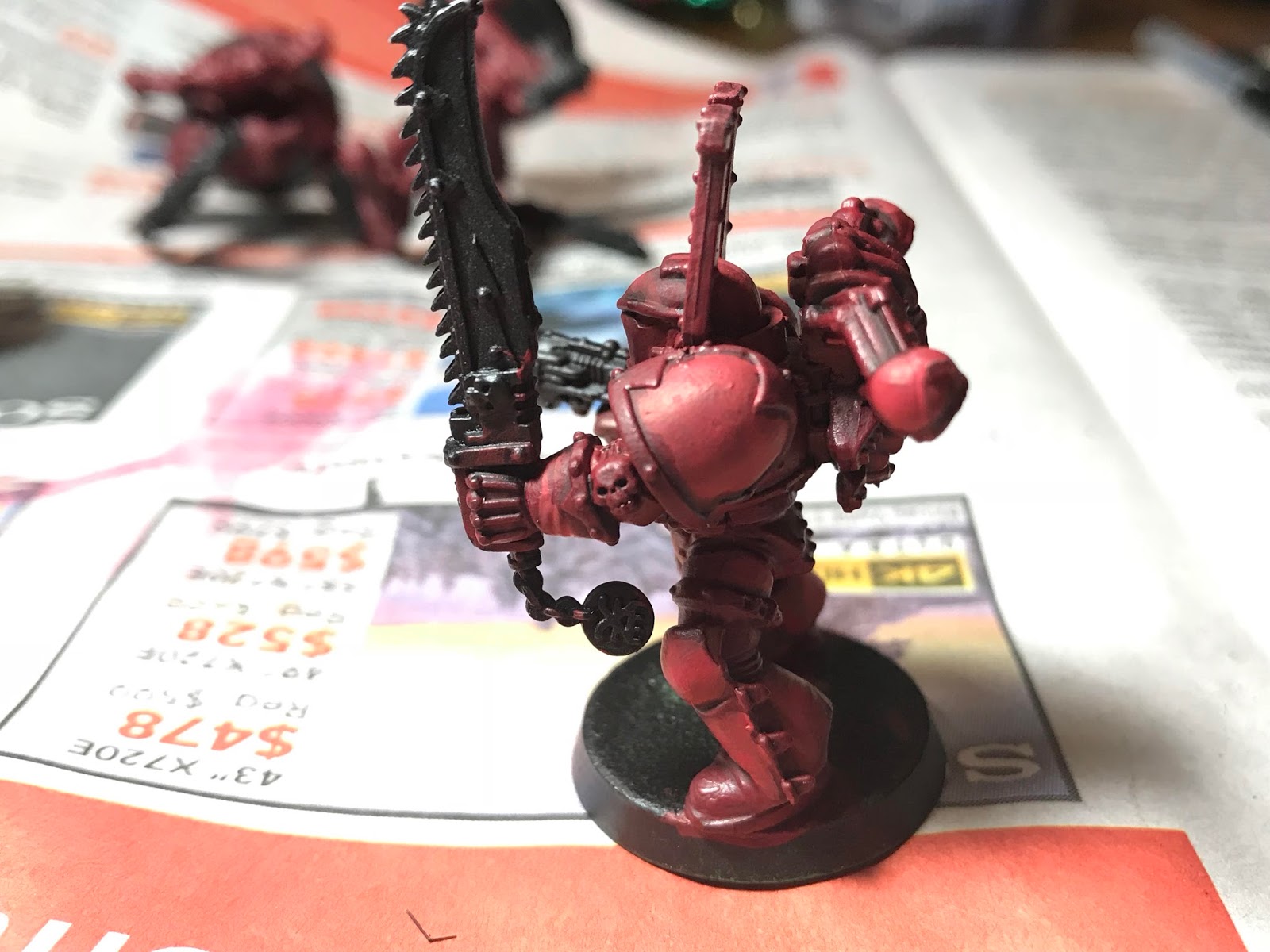 lordofchance wrote:I want to preface by mentioning I have returned to miniatures after close to a 15 year hiatus. I have stripped, based and shaded my khorne berzerker and was fairly happy with the results. Where I hit a wall was with applying the layer paints to the models. I am using the citadel recommended colors Khorne Red (Base)