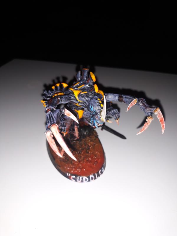 A great paintjob overall, I like those yellow accents, much better scheme than oficial ones. The only thing I would personally re-do are his claws - I'd use Blood for the Blood God in a manner from instructory video or as thick blobs at the tips (depending if Cuddles prefers to stab or to slash his opponents