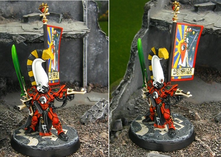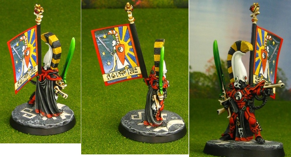 Second, is the older metal Phoenix Lord Asurmen model painted in Saim-Hann colors. The customer wanted this model to match up with the rest of his Saim-Hann Eldar army. The banner is from the Original Eldar Codex from 1994 page 37. "Asurmen's Banner". The customer wanted the model on a larger base. I carved a ruined Saim-Hann symbol into the "concrete" base to make it look like he is standing in an Eldar Ruin. Again, to match the rest of the army.