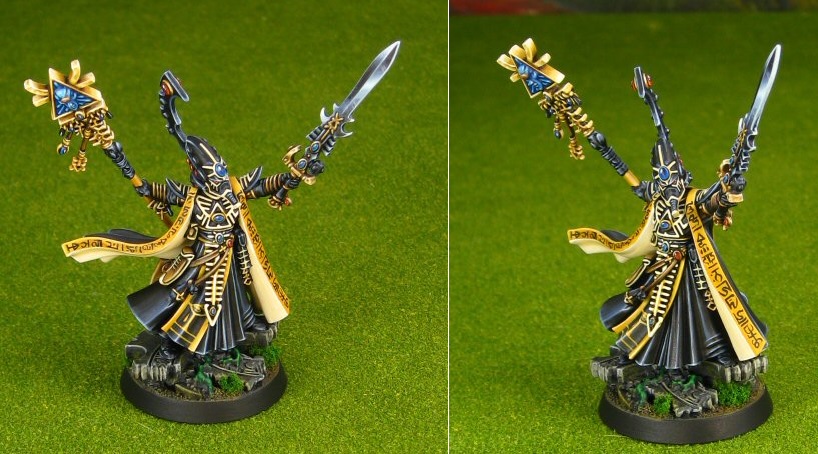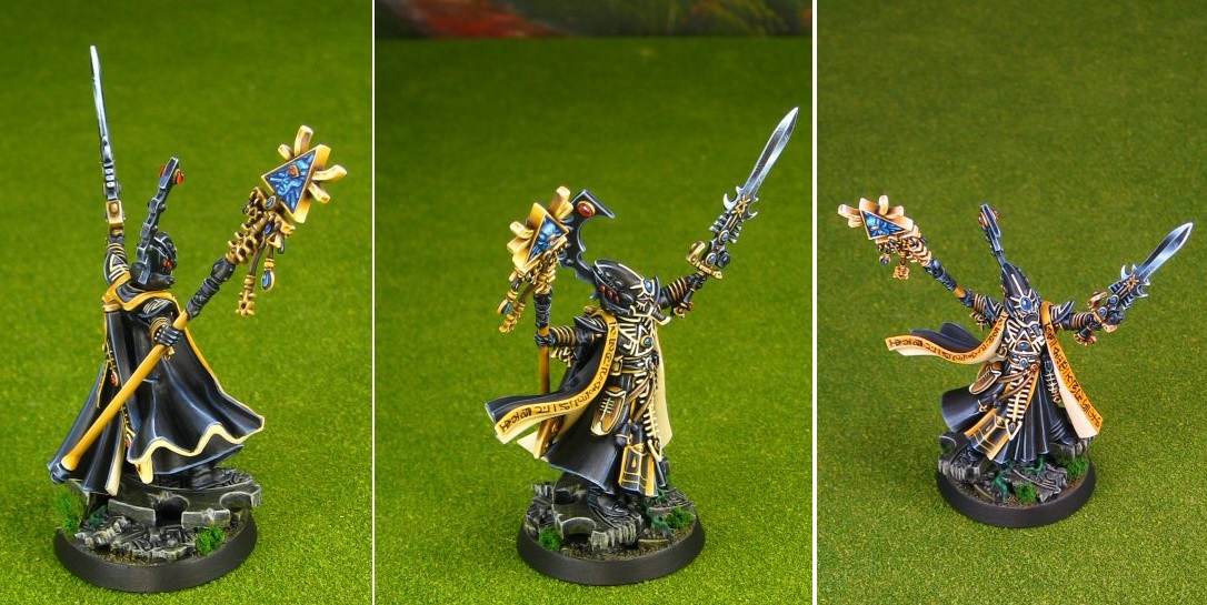 First, is the new plastic Eldrad Ulthran model painted in NMM. The customer wanted the model to be holding the sword instead of casting a spell. I made a minor conversion by removing the sword hilt from the scabbard and cleaning it up a bit. The model is made to be an "Either / Or" with this scabbard piece. Usually, if the model is made casting a spell he will have his sword in the scabbard on his back. If the sword is drawn, the scabbard is not supposed to be placed on the back because the sword is molded into the scabbard. This did not feel right, so I made a third option by removing the sword hilt from the scabbard and going ahead an placing the scabbard on his back. It took a little bit of finagling to get the scabbard cleaned up but I think it worked out.