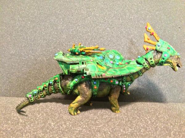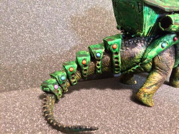 I'm working on it, feedback is part of the reason I post things. I am going to put it on a base, I have ordered one from my local shop. I am cleaning up the paintjob, and I am thinking of going back and adding green stuff details to it and some of my other dinos, to kick them up a notch. I have worked on the gems, they look better already.