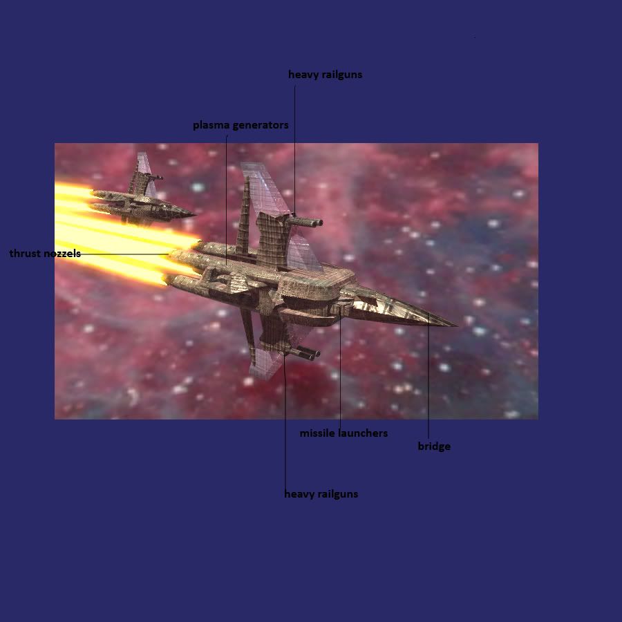 This girl has the firepower of a small fleet, boys! Take good care of her, 'cause you have no idea how many tax-credits went into making this baby. She's the heaviest ship in the fleet, even if she don't have straight up size. 2 Super Mass-drivers, 20 Rail-guns, 60 Point Defense Guns, and 100 Typhoon Missiles. If you die on this ship, I eat my mahogany office desk. Oh, and we managed to jury rig some Yahan engine to 'er. It ain't workin' fully, but that thing can reach at least plasma speed and three times light, probably could go faster if we could fix it up anymore. Not to mention it's nearly indestructible, so it's cheap to maintain too!