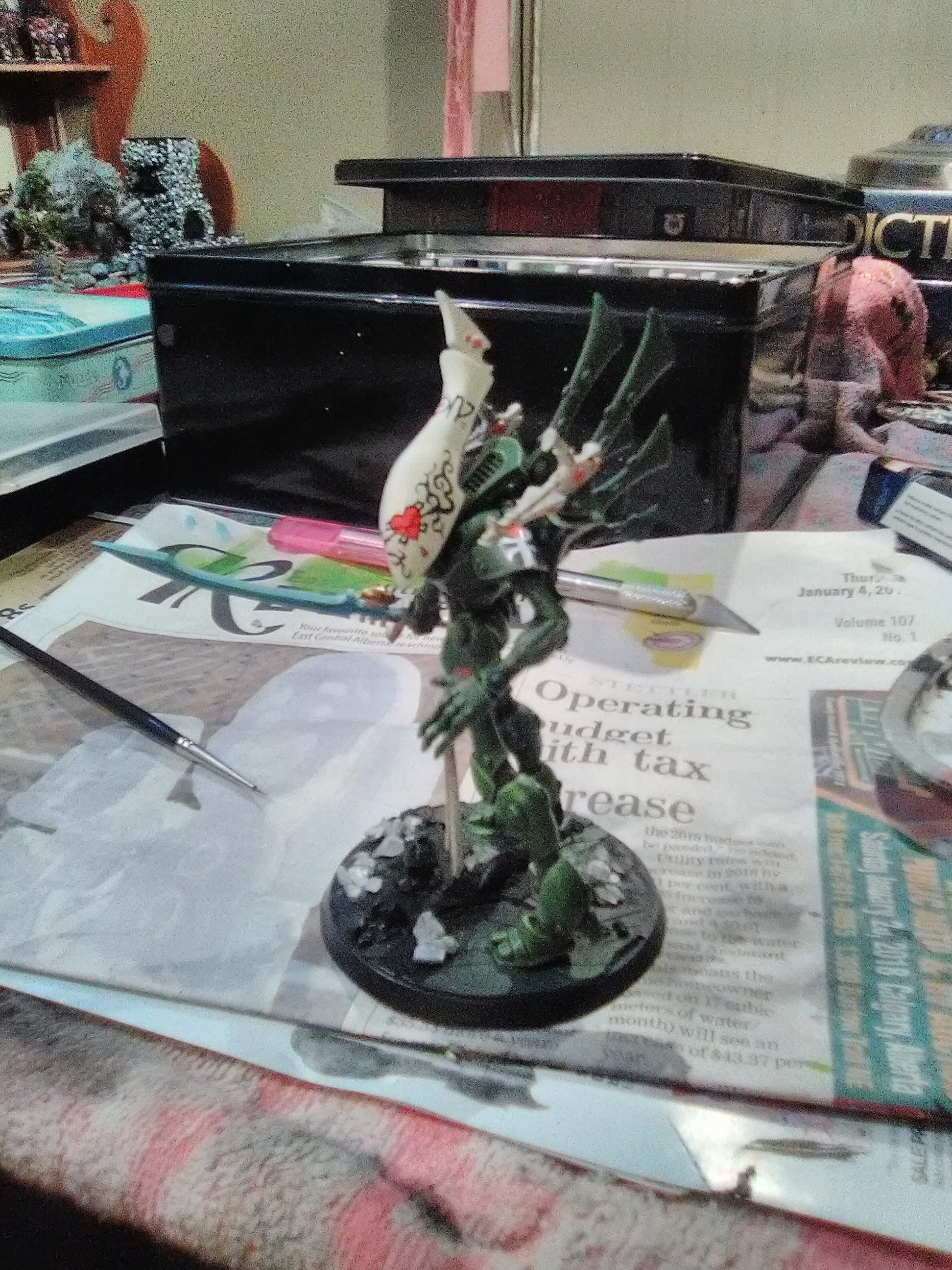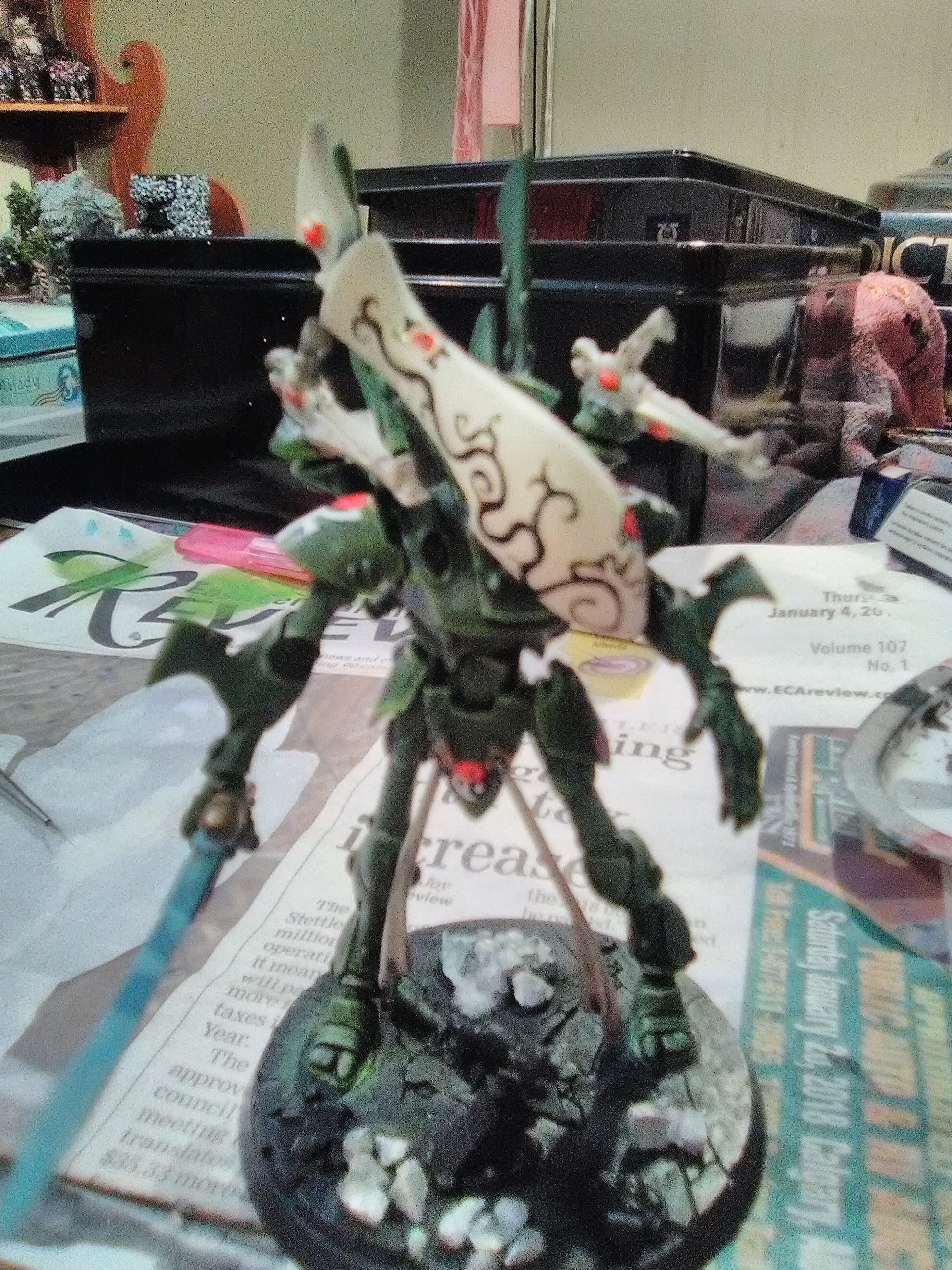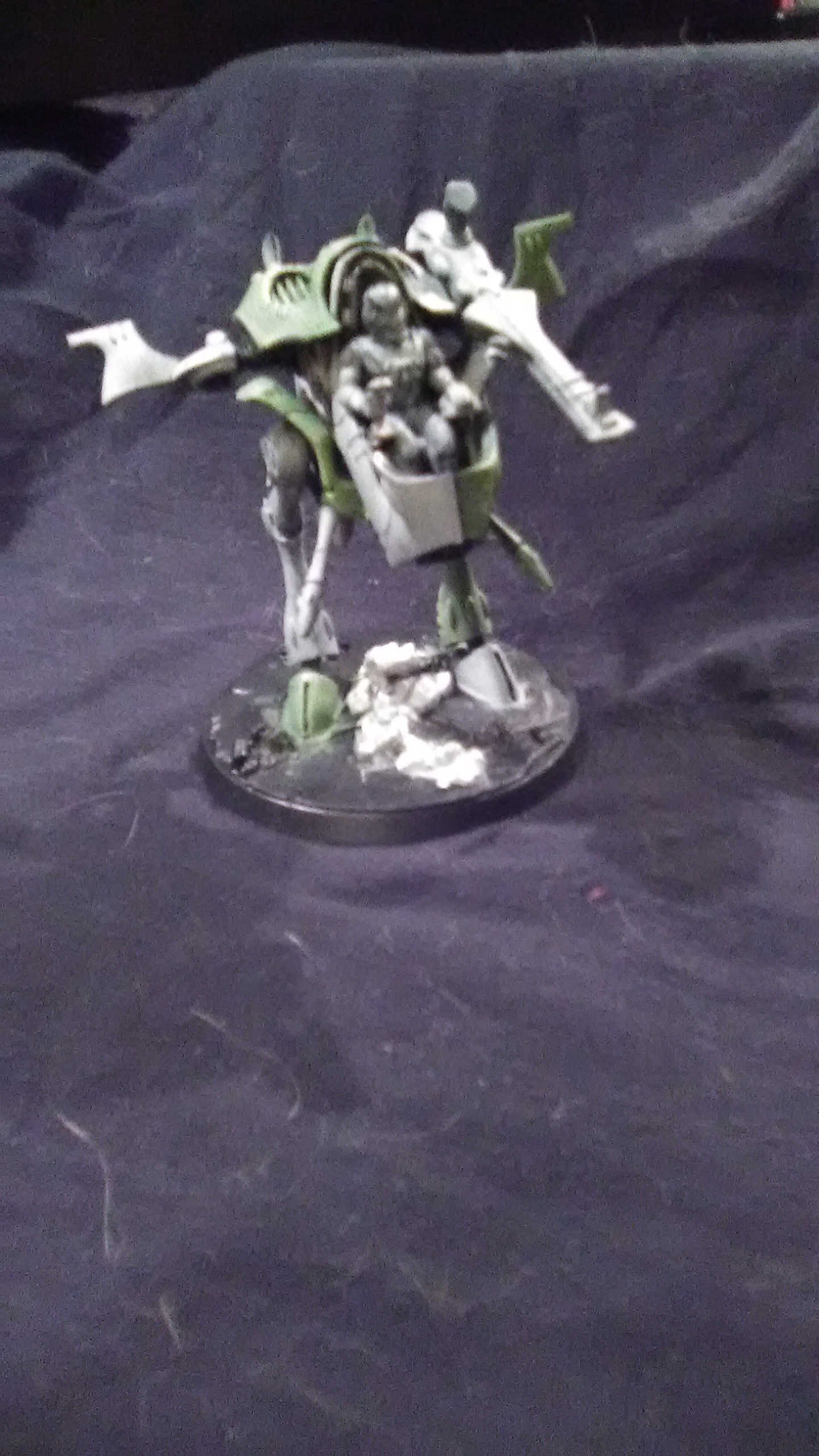Anyways, let's start off with the Wraithlord I just did some decal reworking on. I have the rest of a SC box finished to this level, plus another War Walker and Wave Serve primed. I have a ton of Guardians headed my way and some will become Avengers and some Fire Dragons. Can't wait to kit bash up some Fire Dragons! They are the old school push fits, so they look quite striking next to modern Guardians.