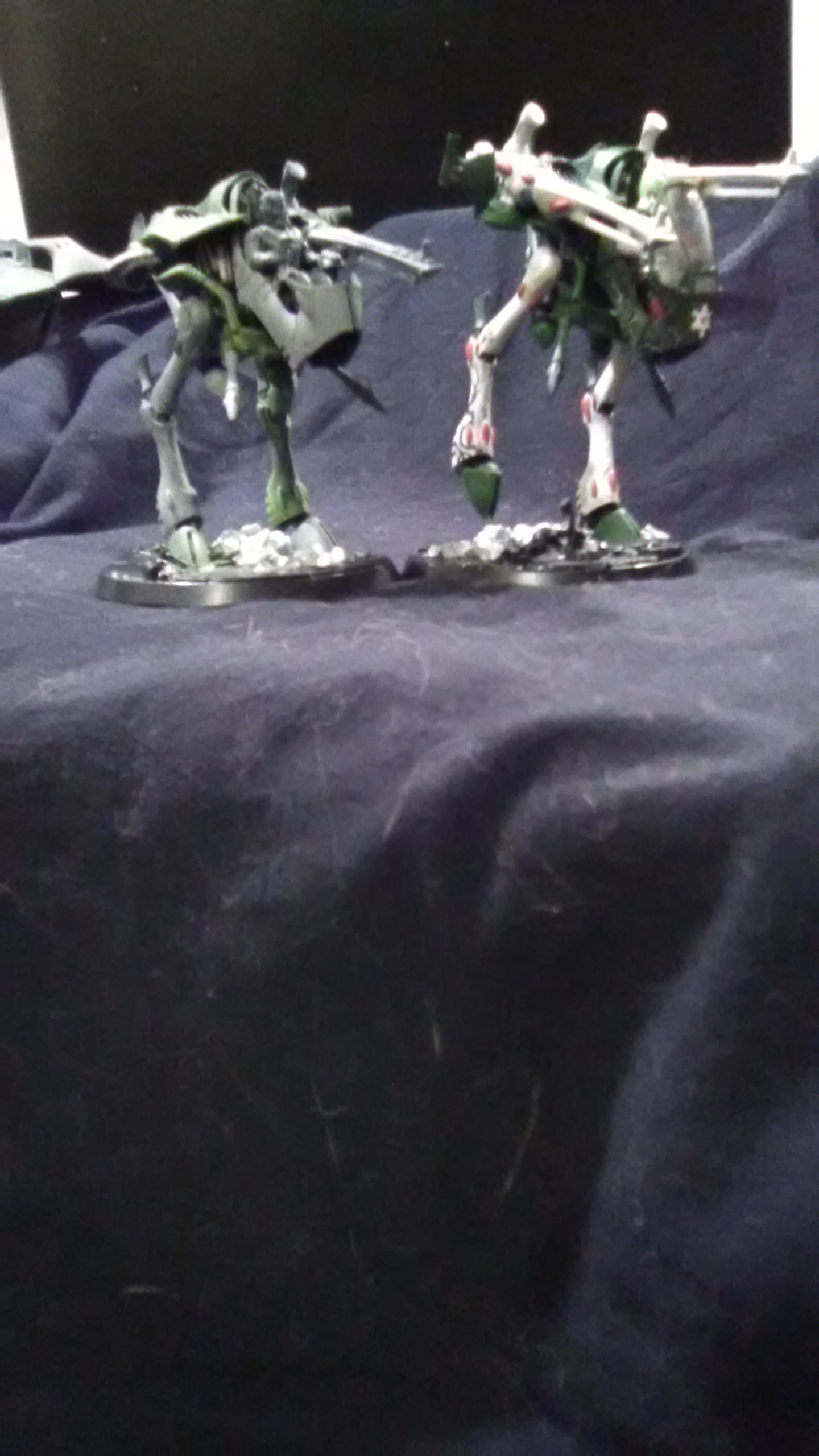 Anyways, here is Walker #2 with the green layered up and the grey "primer" for the white parts. And a shot of him with #1 for comparison.