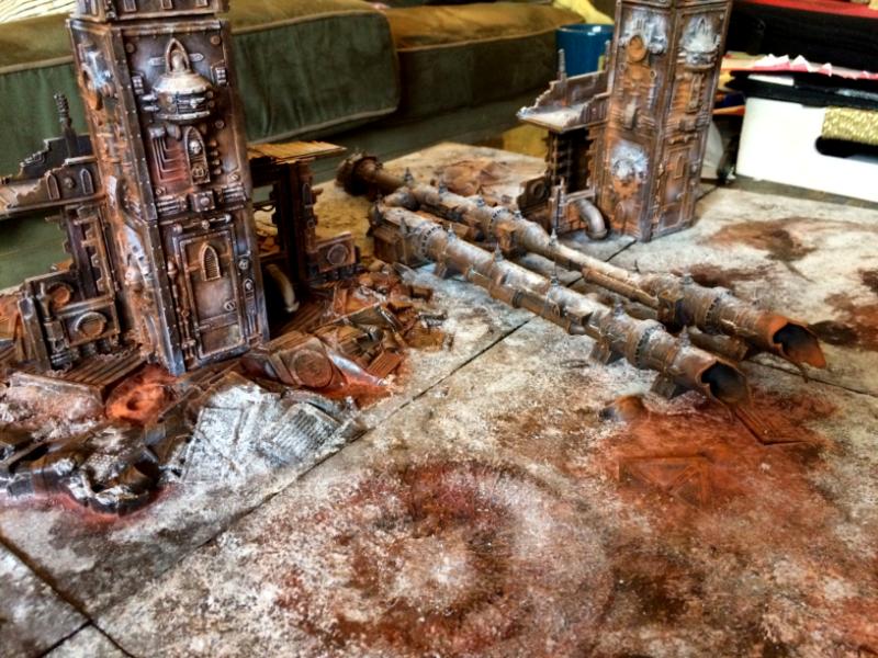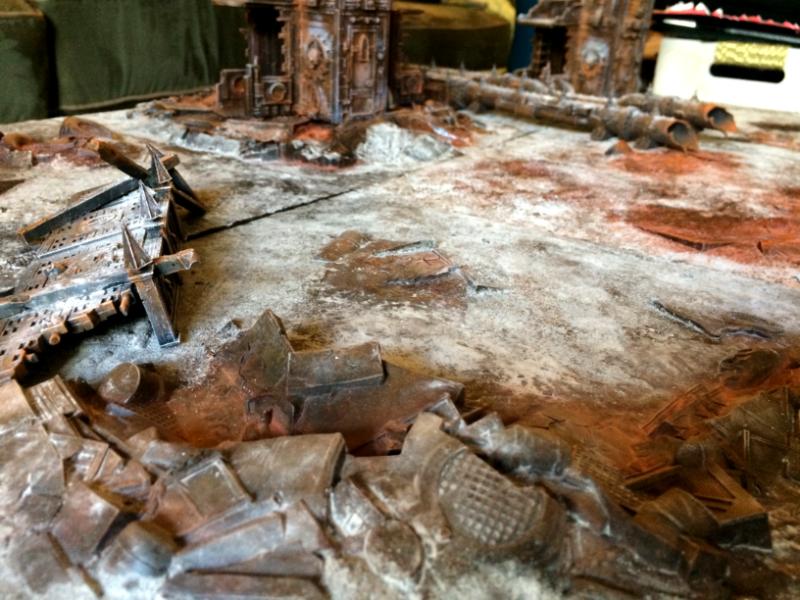 The ash is a weathering pigment from Secret Weapon Miniatures. The weathering pigments are super flexible in terms of the effect you want to achieve. For this, I put a light coat of pigment fixer down before "dabbing" the area with the ash pigment to create the gritty texture. Too much pigment fixer makes the effect runny (which looks more like the other rust effects on the rest of the pieces).