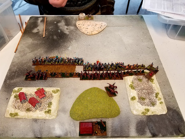 While my line shuffled forward, Nick used his pips to maneuver his knights from column to line. I decided to try and reach Nick's camp with my two light horse for an early point.