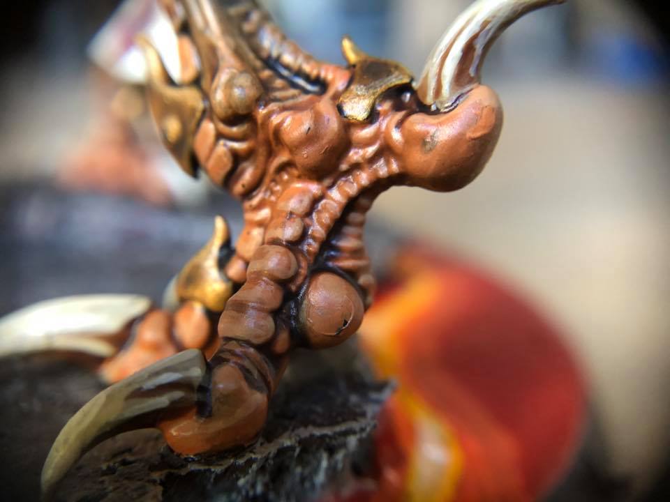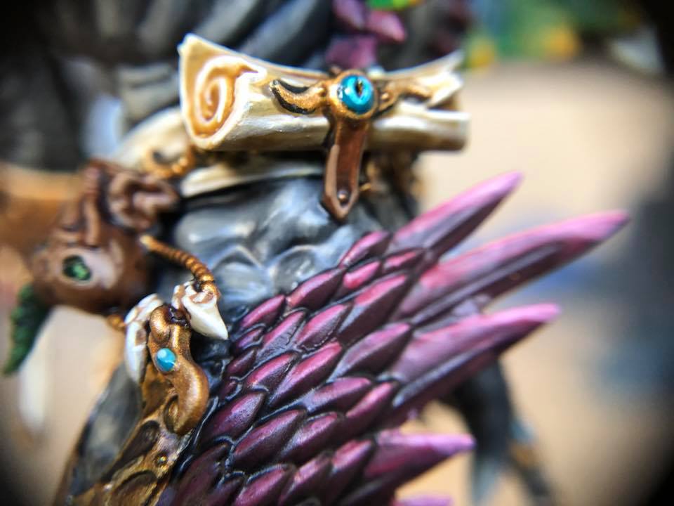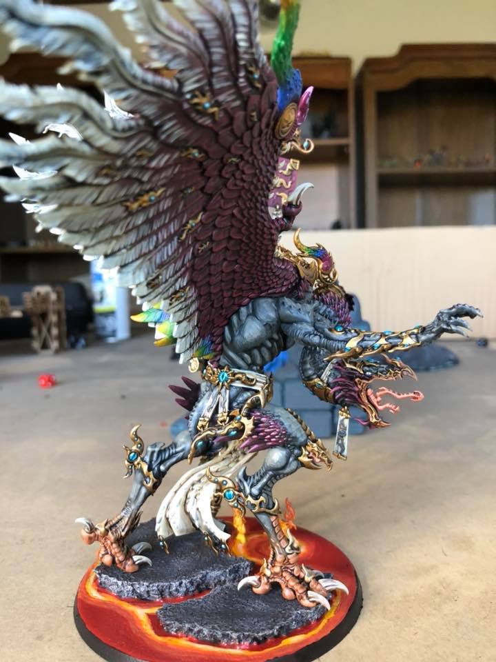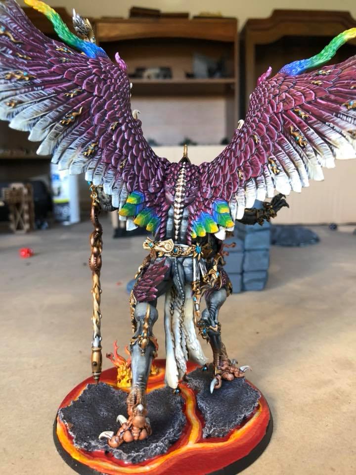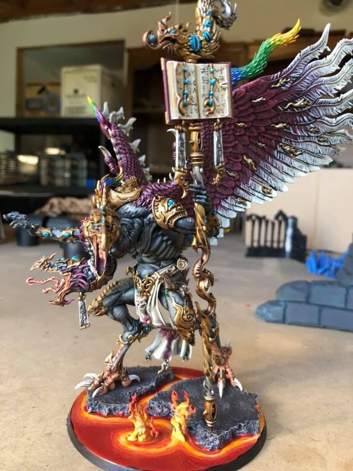 So I started my tzeentch demons making not-so-pink horrors followed by grey horrors, because I like alternate paint schemes and I like my demons to be not quite so bright as tzeentch usually is. I chose to represent change with a few color spectrum feathers on the not-so-pink horrors and on the banners and icons. Then my husband got me Kairos for Christmas, and I had to figure out how to make this color scheme work for him. This is what I came up with. C&C welcome.