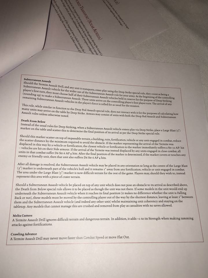 Tamwulf wrote:Without knowing what Subterranean Assault, Death from Below, Melta Cutters, and crawling advance do... meh? The only direct comparison would be to a Anvillus Pattern Dreadclaw Drop Pod. They are both FA transports that can carry 10 models, though the Dreadclaw can transport a Dreadnought, or Terminators. It's also an assault vehicle with the Flyer rule, so can take off again after it delivers it's cargo. The nice thing about the Dreadclaw is the ability to jink and torch models it moves over.