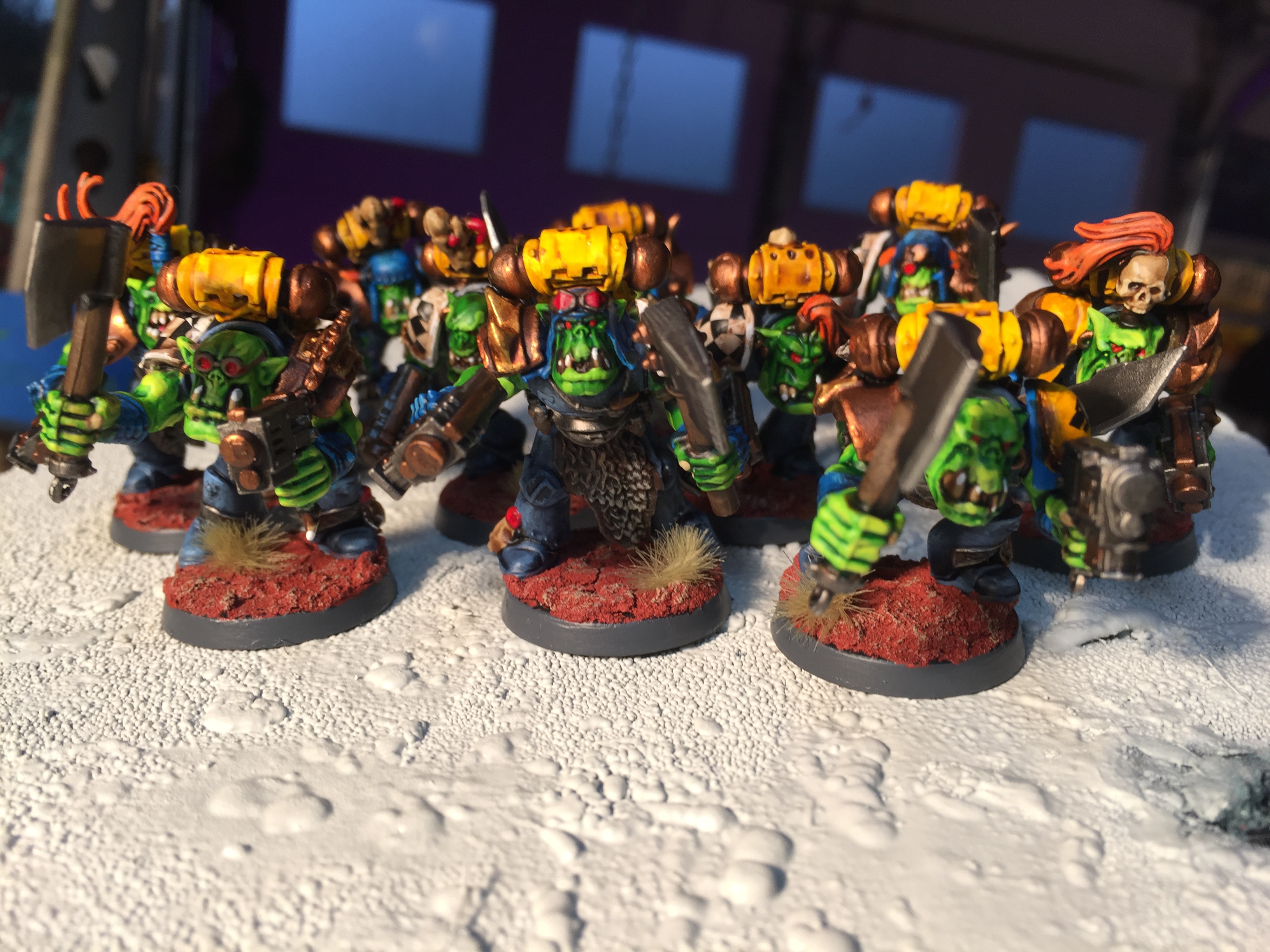 I am trying to get up to a 3 x 30 mob of Boyz to run but don't want to pay $30 a box. I figured out that classic space marine bodies are easily converted to Ork boyz with two small balls of green stuff. One to bend the body forward like an ork and one to fill the neck cavity. I used all those unused extra pouches and magazines that they give you for Boyz to hide the middle ball of green stuff. I think they look cool. And yes, I know my barrels are not drilled.
