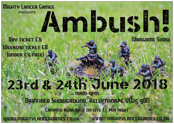 Ambush! is taking place on 23rd & 24th June this year (2018) at the Rix Pavilion, Driffield showground YO25 9DN from 10am-4pm each day and more information can be found on the event information page https://ambushwargamesshow.wordpress.com/ and there is also a Facebook page for chatting and discussing.