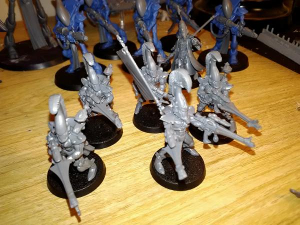 Kharneth wrote: Dire Avengers - should I use the same blue scheme I use for Alaitoc or should I make their blue color unique? They'll be notable with white heads and plumes, but I'm wondering how to do the blue (I want my aspect warriors to be appropriately colored).