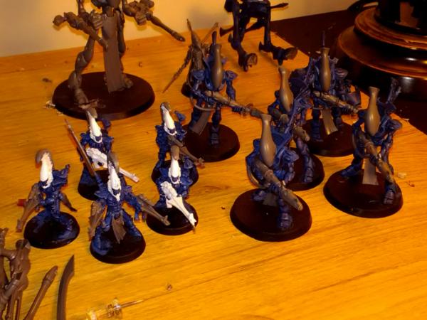 I made the Dire Avengers in the same blue as the Wraithguard. I'm worried about their helmets, though. I'm not sure how I'm going to get a flat coat of white or yellow on their helmets.