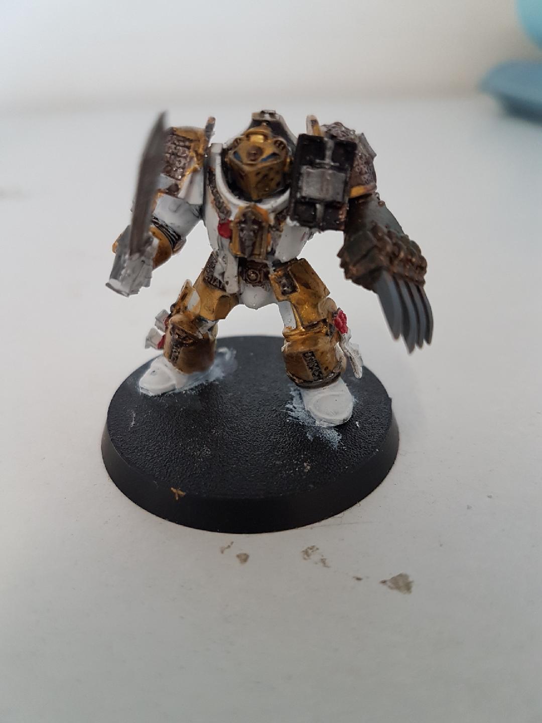 1 Terminator Librarian with Archeotech Storm Shield (shield actually projects out of the small shield to cover most of torso) and Force Stave