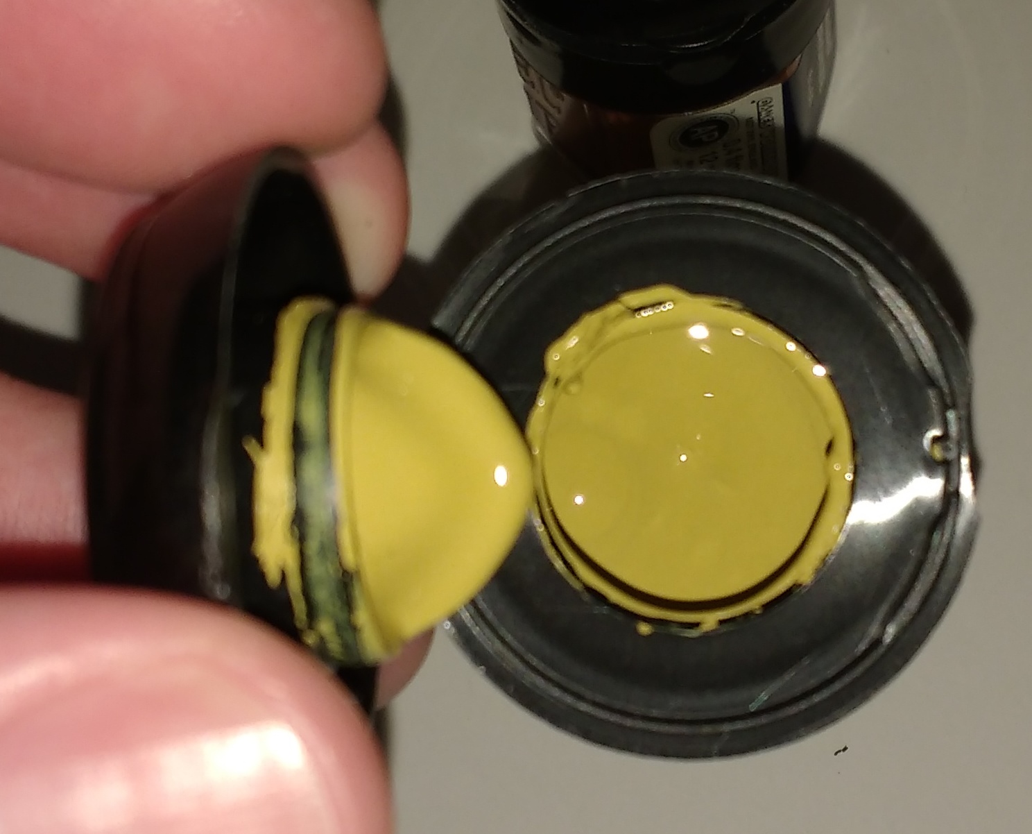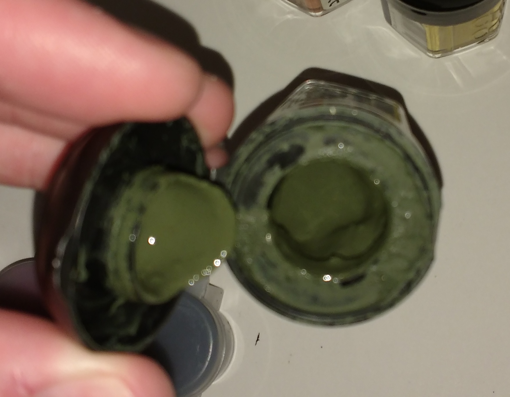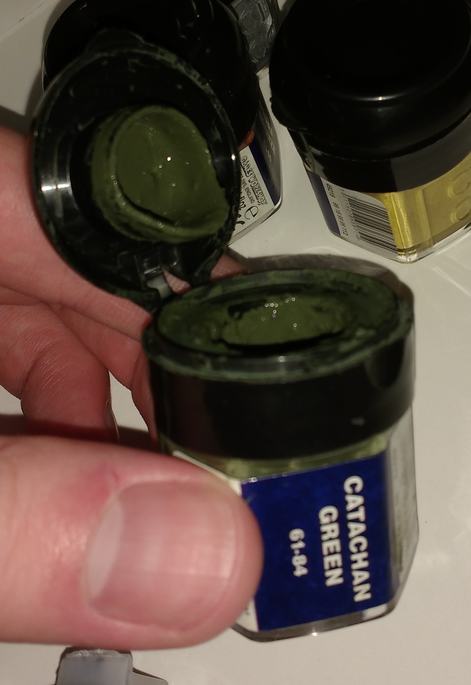 - Catachan green - some wet and usable paint, but a lot is still in a gloppy or partially-solidified state, so it still needs a lot of vigorous stirring to use most of it. Potentially more than half full if all is stirred in, but some may be dried beyond use.