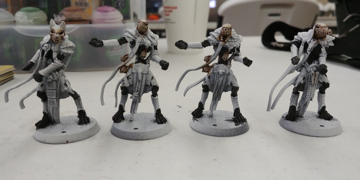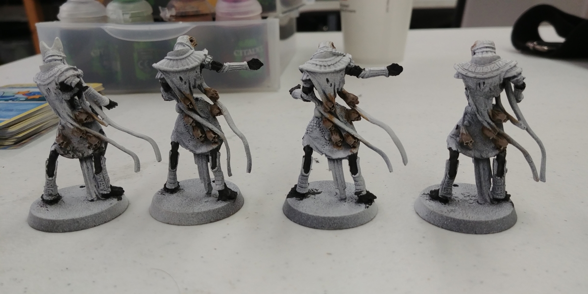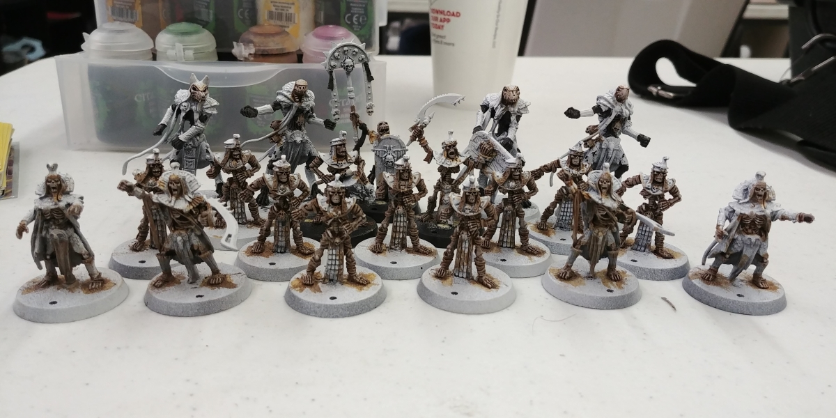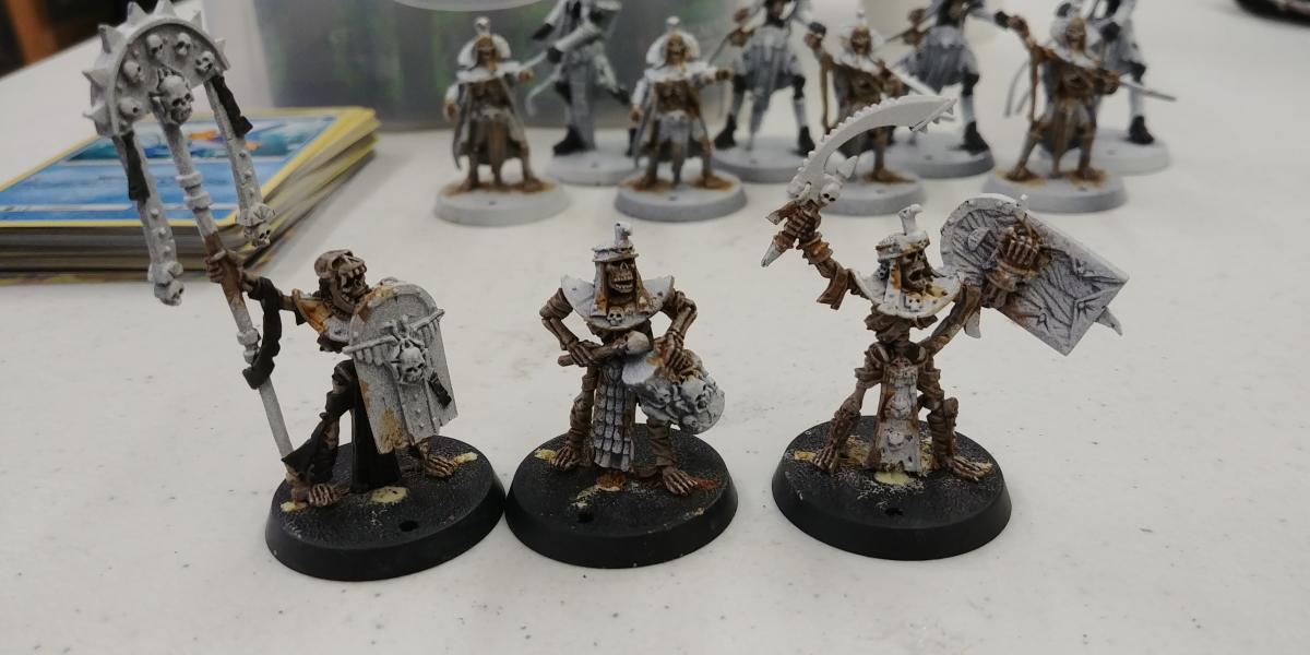 I haven't posted these guys on this site yet, so i might as well share. I've been slowly working on an all-metal khemri blood bowl team for a local league. So far I've gotten them pre-shaded with primers, the black undercoat for the skins on the tomb guardians, and the bone colors on all the other skeletons.