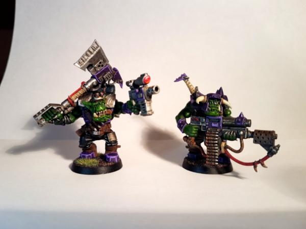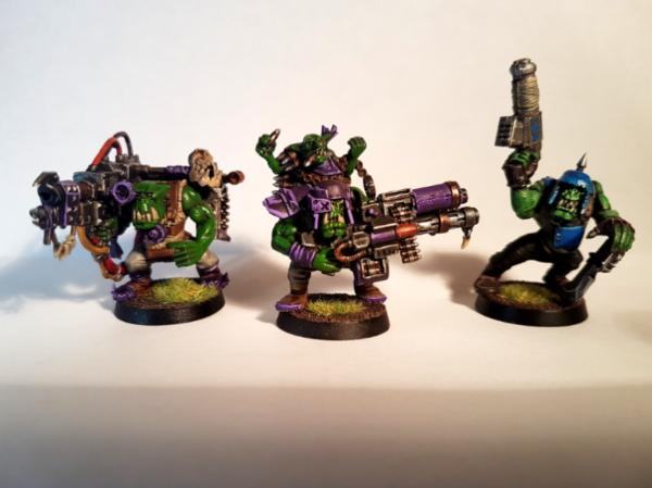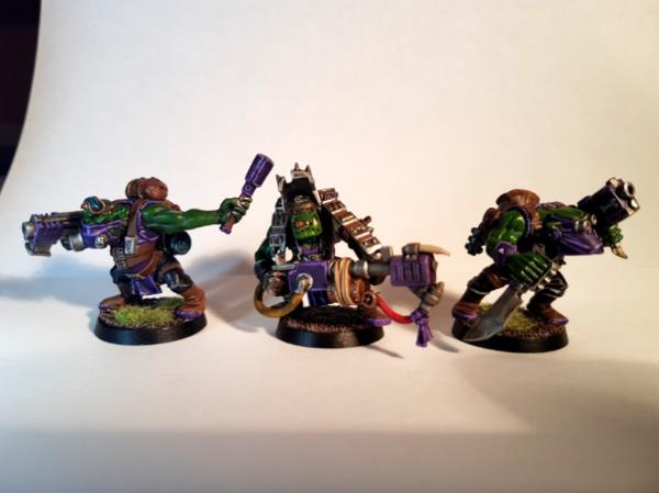 And finally the "sharp shooters" : Squintin' "Can't see 'em" Ed (Loota), "Shoot dat anyway" Girgark (Spanna w/ big shoota) with his grot Howla (Comm specialist) and Da Blue Git (Boy).