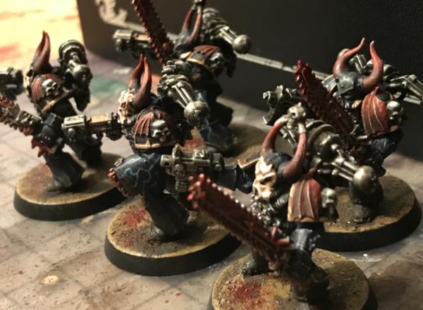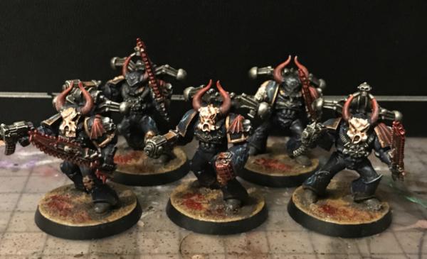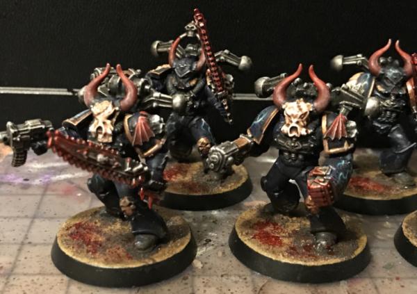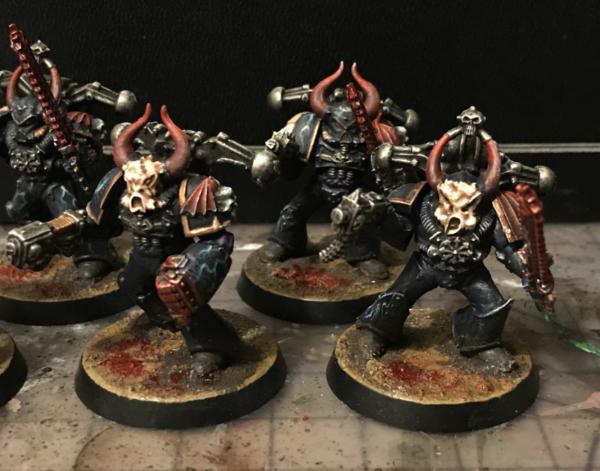 Since the majority of my marines have the Night Lords conversion kit helmets and Heresy-Era MK III & IV Power Armor - I decided to go with much more traditional Chaos looking armor for these more insane actual warp-worshippers. For this I went with the older early 3rd edition era chaos marines for this with arms from modern kits, but stuck with my green stuffed flayed Flesh like the rest of my collection.