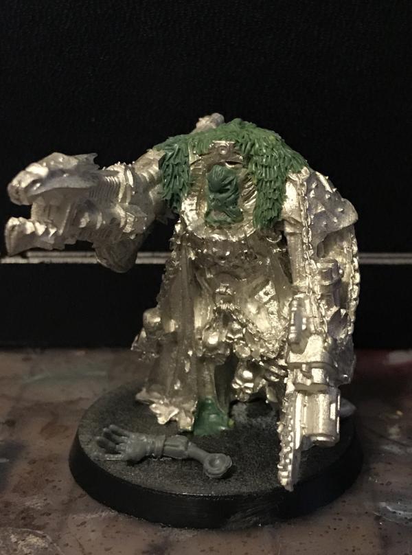 Now, for this guy I used one of the 2 (or 3?) pewter Chaos Terminator Lords from 3rd edition. I’ve always loved this mini in particular and remember him from things like the Fall Of Medusae campaign booklet and some white dwarf battle reports. A major things I wanted to achieve was making Arioch look like a distant echo of the men he leads. Since he and his Chosen are the only truly devoted I wanted him to kind of embody a Demon-Thing’ within the night Lords legion - Warped and possessed, but more by the standards of the IIIV Legion. I even went so far as to try and mimic the design of Horus’ red glowing gorget from Adrian Smith’s amazing and iconic artwork depicting Him facing the Emperor. I also wanted him to seem more like a “Warp death machine” with the chain-bayonet Bolter and arm cannon (which I THINK was supposed to represent the old “Kai-gun” weapon chaos marines had in their 3.5 codex, though it also looks a bit like a traitor plasma-cannon.) I also sculpted a Flayed Skin mask, like many of the Warbands marines. I added a few other things; like the flayed & mutilated human on his back and sculpted his fur-pelt...