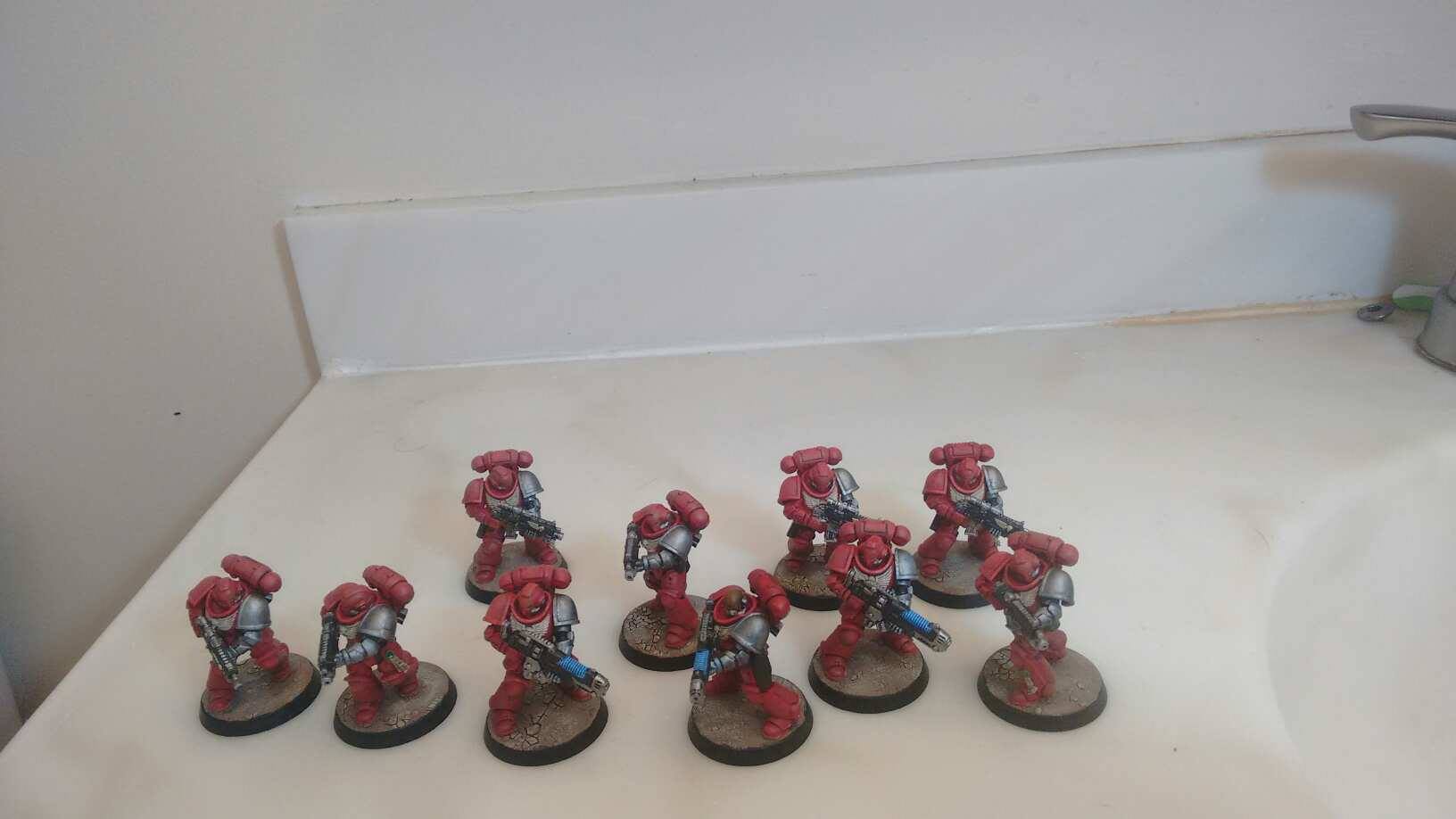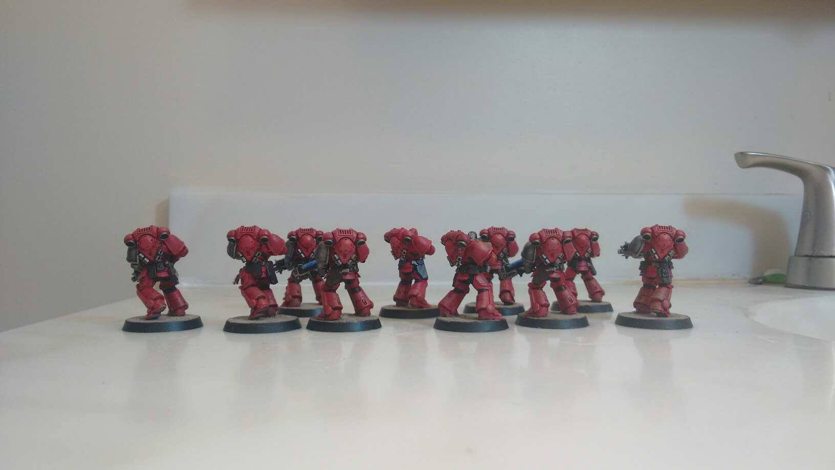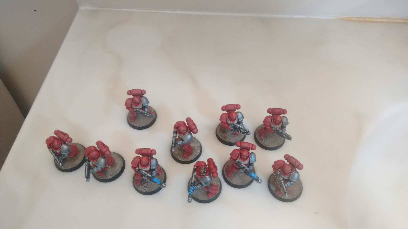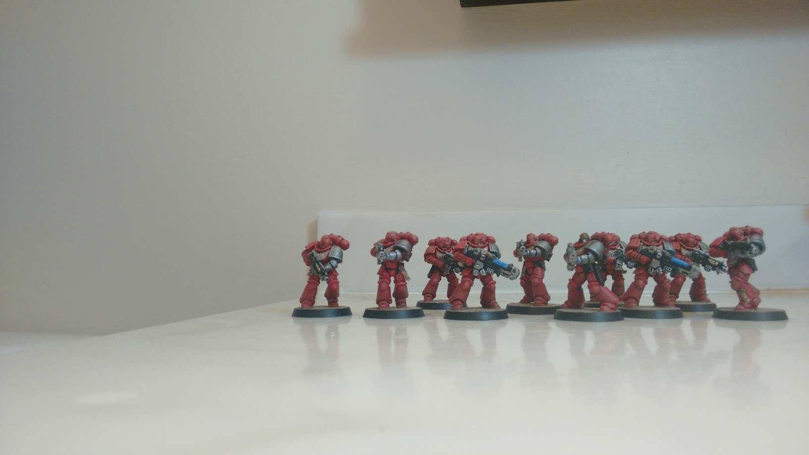 So these are 7 intercessors, 2 hellblasters and a hellblaster sergeant from the Dark Imperium box, done in the colours of a headcanon Blood Angel successor chapter called the Red Grail Crusaders. The rest of the footsloggers are going into the next batch.