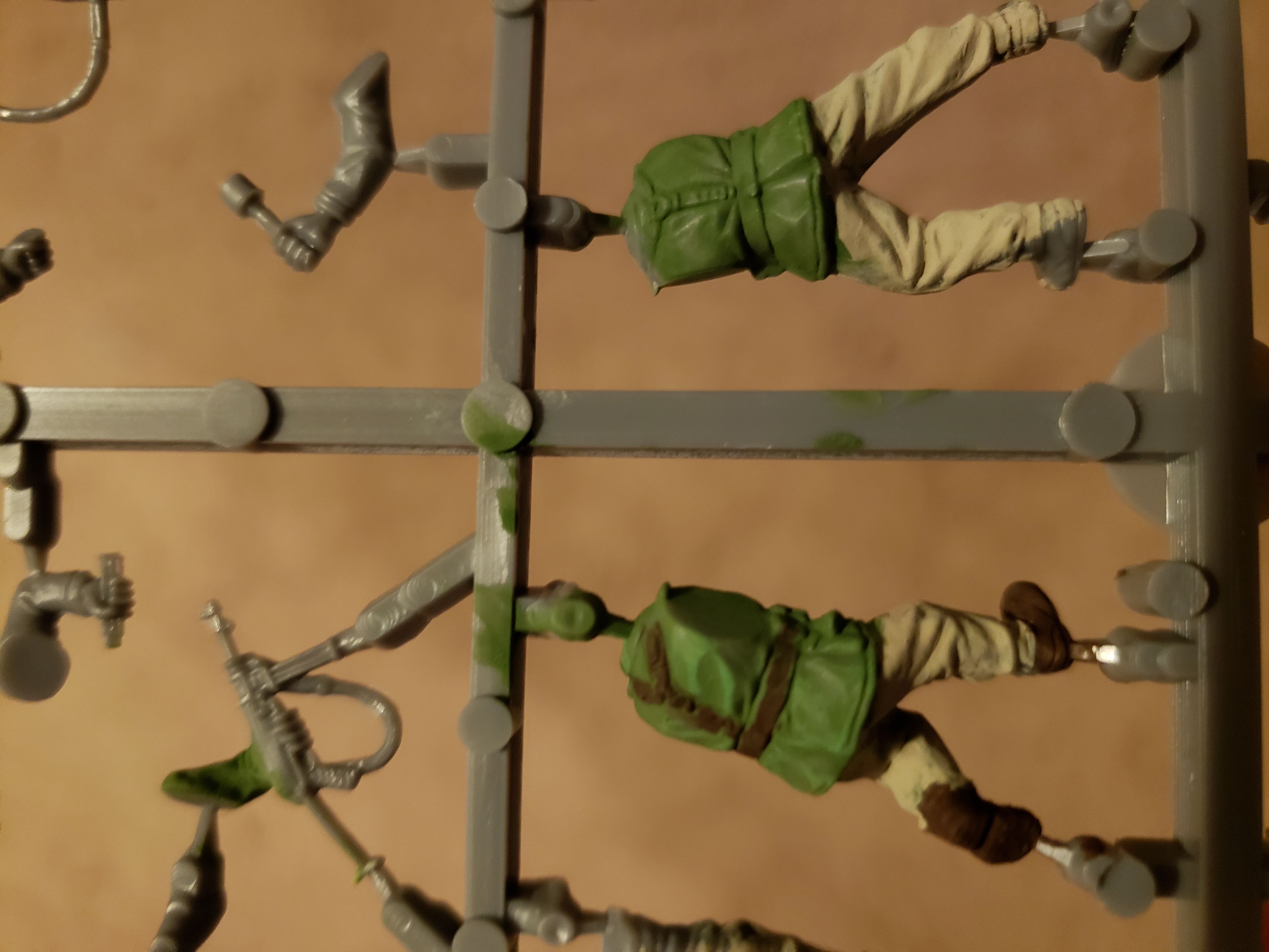 The yellow came out a little brighter than expected but I am okay with it, it reminds me of a British camo and I can work with that. As far as the dark color I mixed the yellow, burnt umber, and taupe at a ratio of 50/25/25. This mixture went on an unprimed part pretty well which surprised me. As far as the uniforms go, yes the matte rocks on the uniform and kelly green is a good highlight for olive green in my opinion.