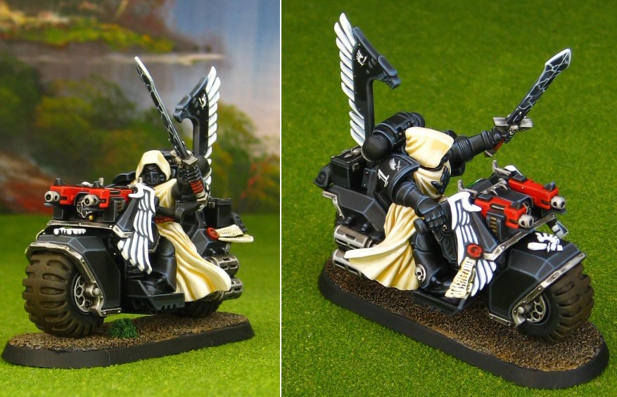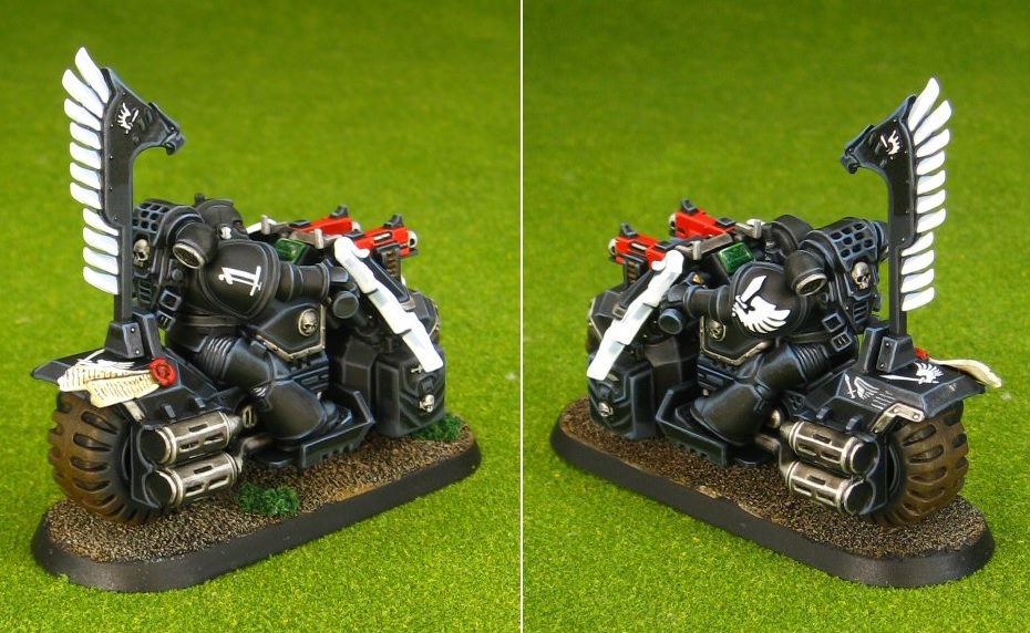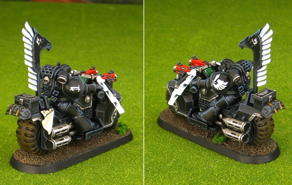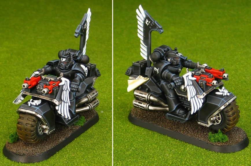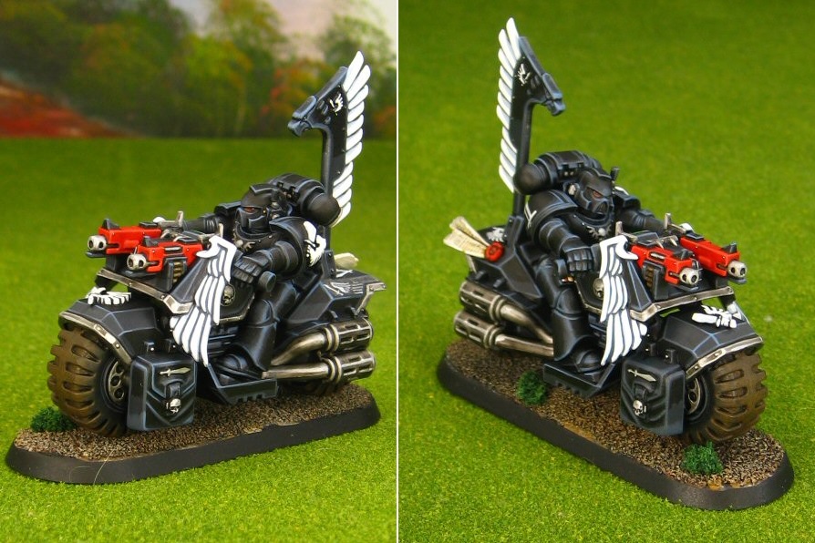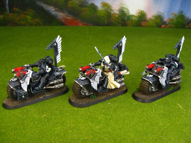 40K Space Marines Dark Angels Ravenwing Biker Squad. Three bikers in all, two troopers and one sergeant with powersword.