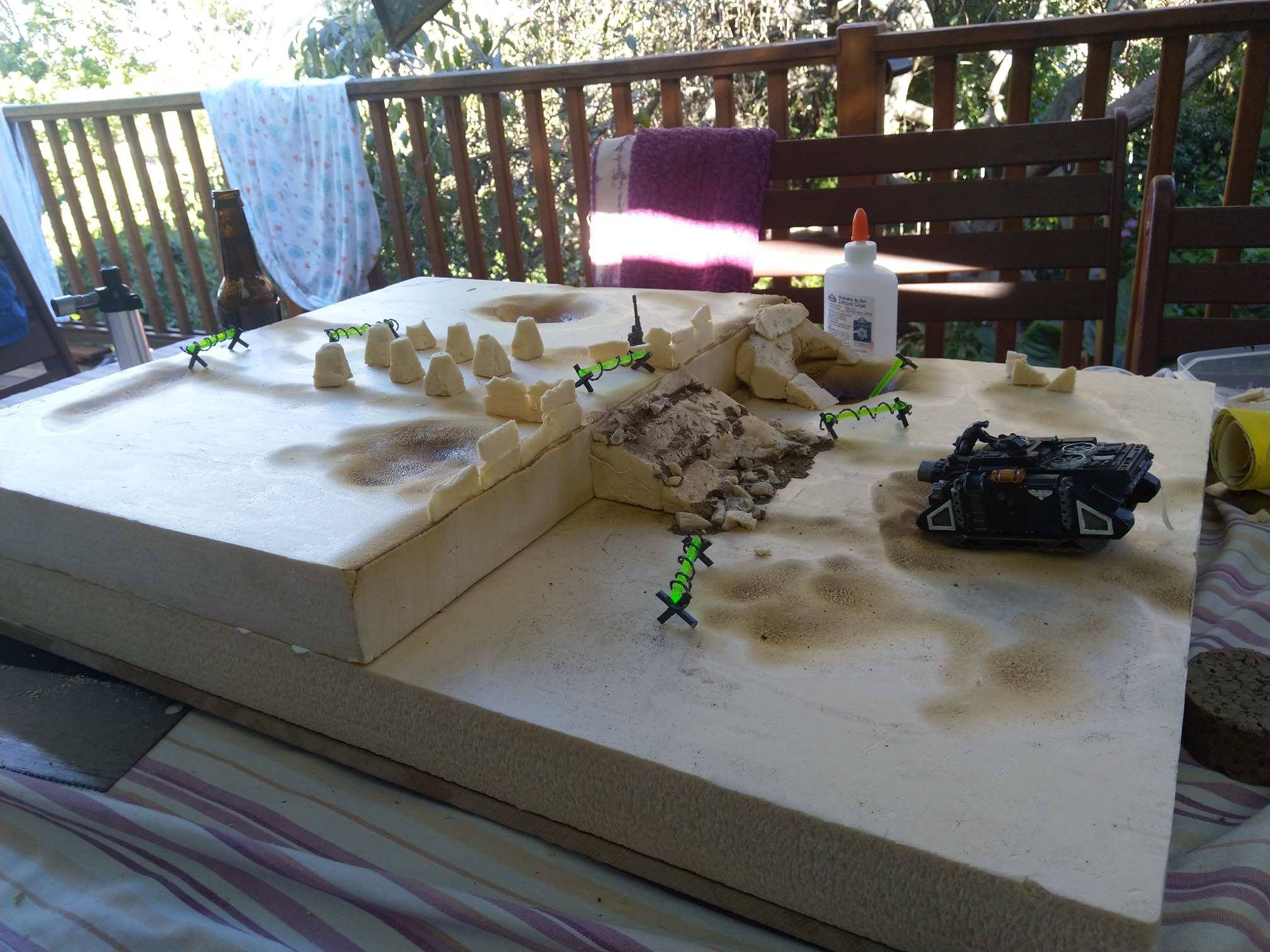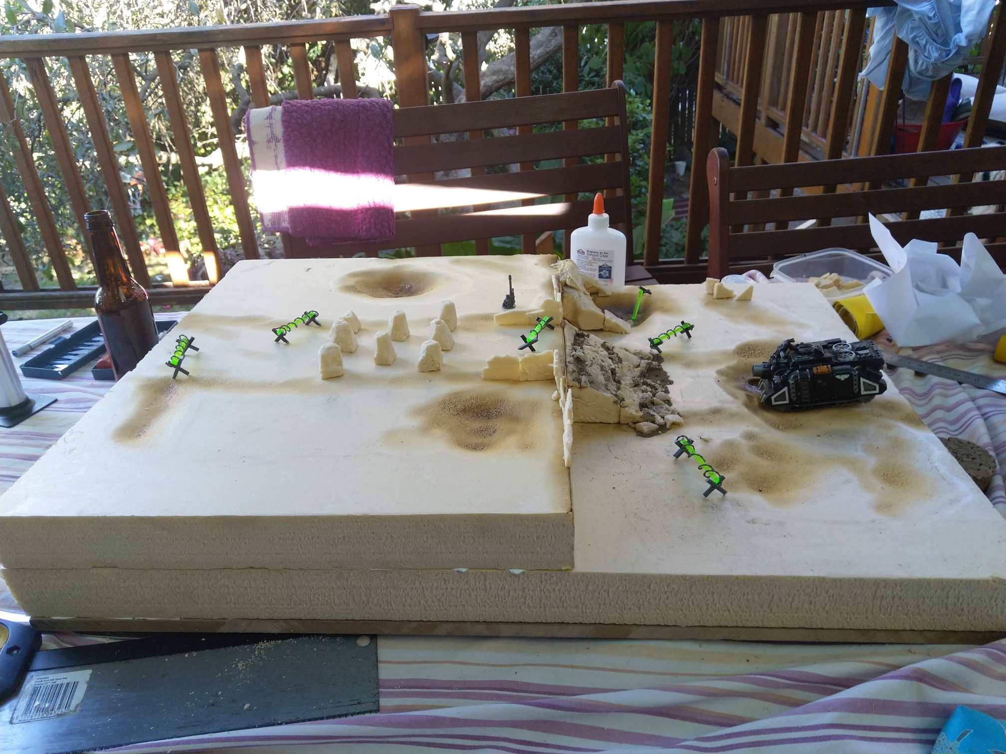 Looks cool so far. I have a couple of critiques as far as playability goes; you're going to need way more features of the LOS blocking variety as well as more scatter terrain for cover. Also, models will be able to completely hide behind the ridge in the middle of the board, so the player on the low side will be able to stay completely out of LOS in the center and force the other player to come to the edge of the terrace which will makes things pretty unbalanced.