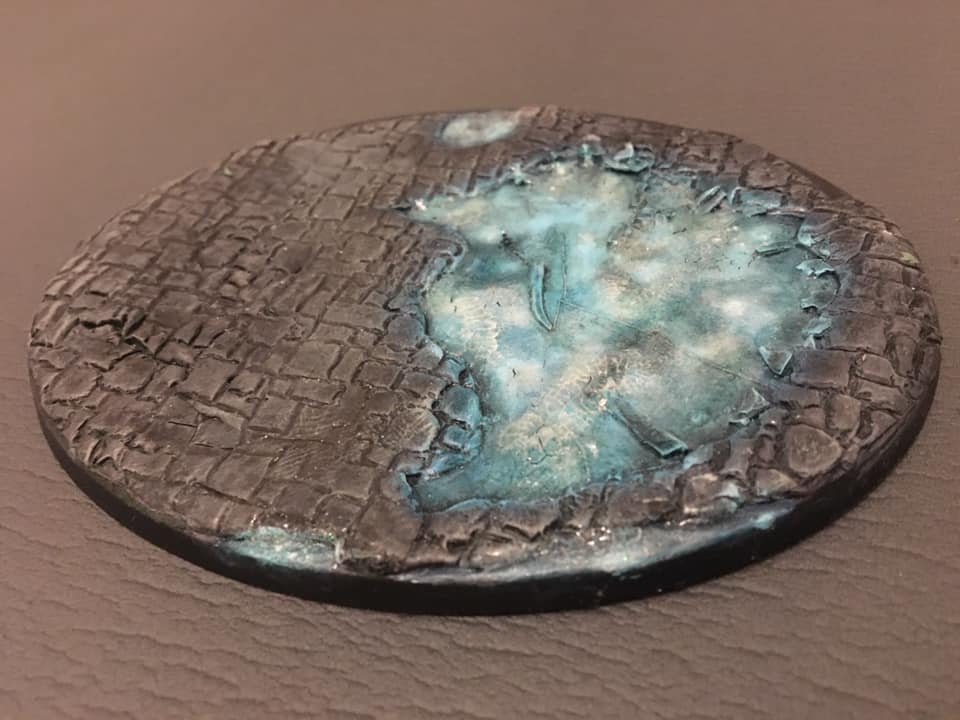 Due to the size of these models it seemed a waste of green stuff to fill in the base under the bladed wheels. Instead I turned the base around and filled the gaps with cracklepaint. I liked the idea that there were pools of magical glass submerging parts of Shadespires streets or foundations. I think the effect worked well and I will be exploring this more with other units.