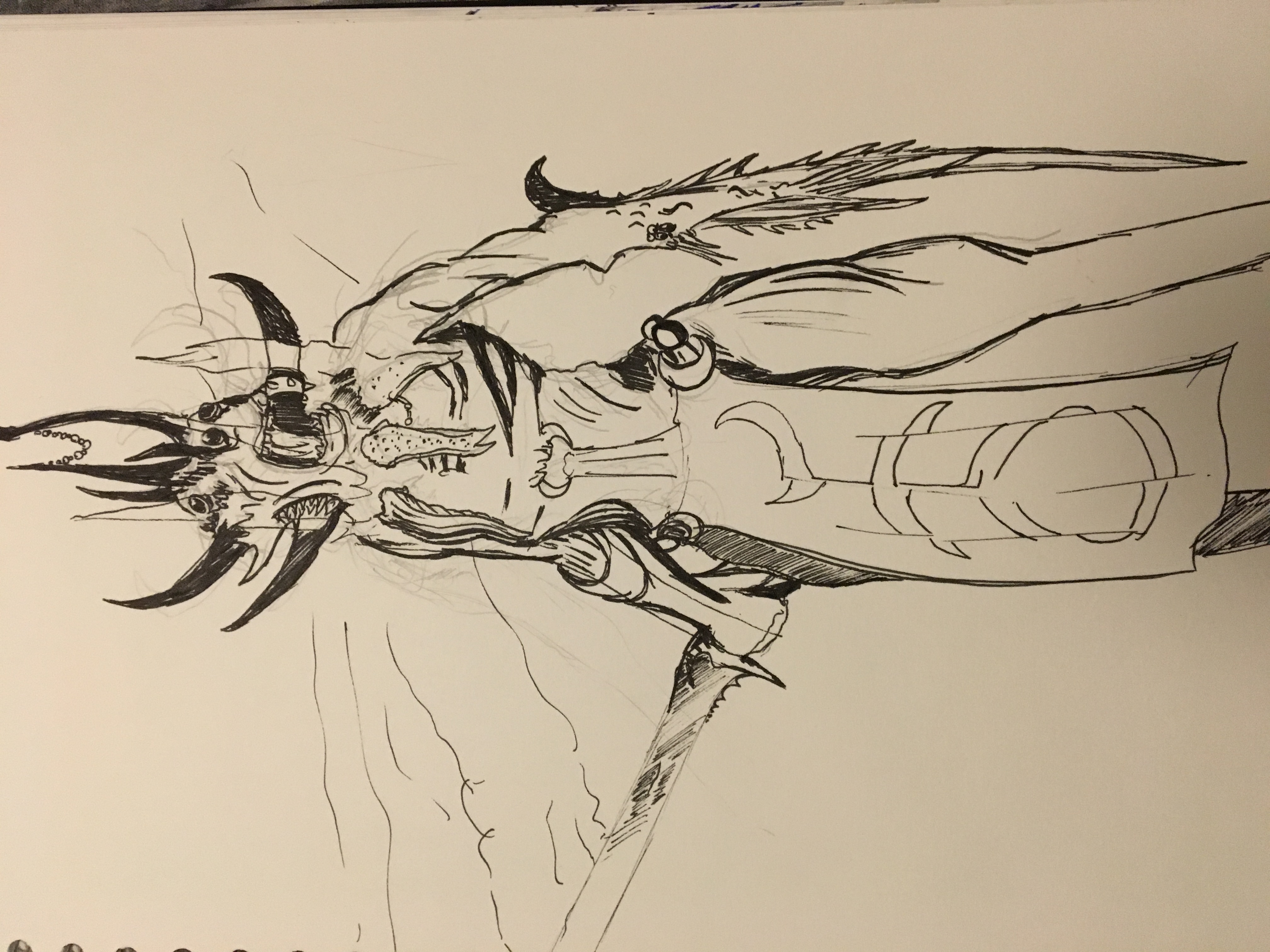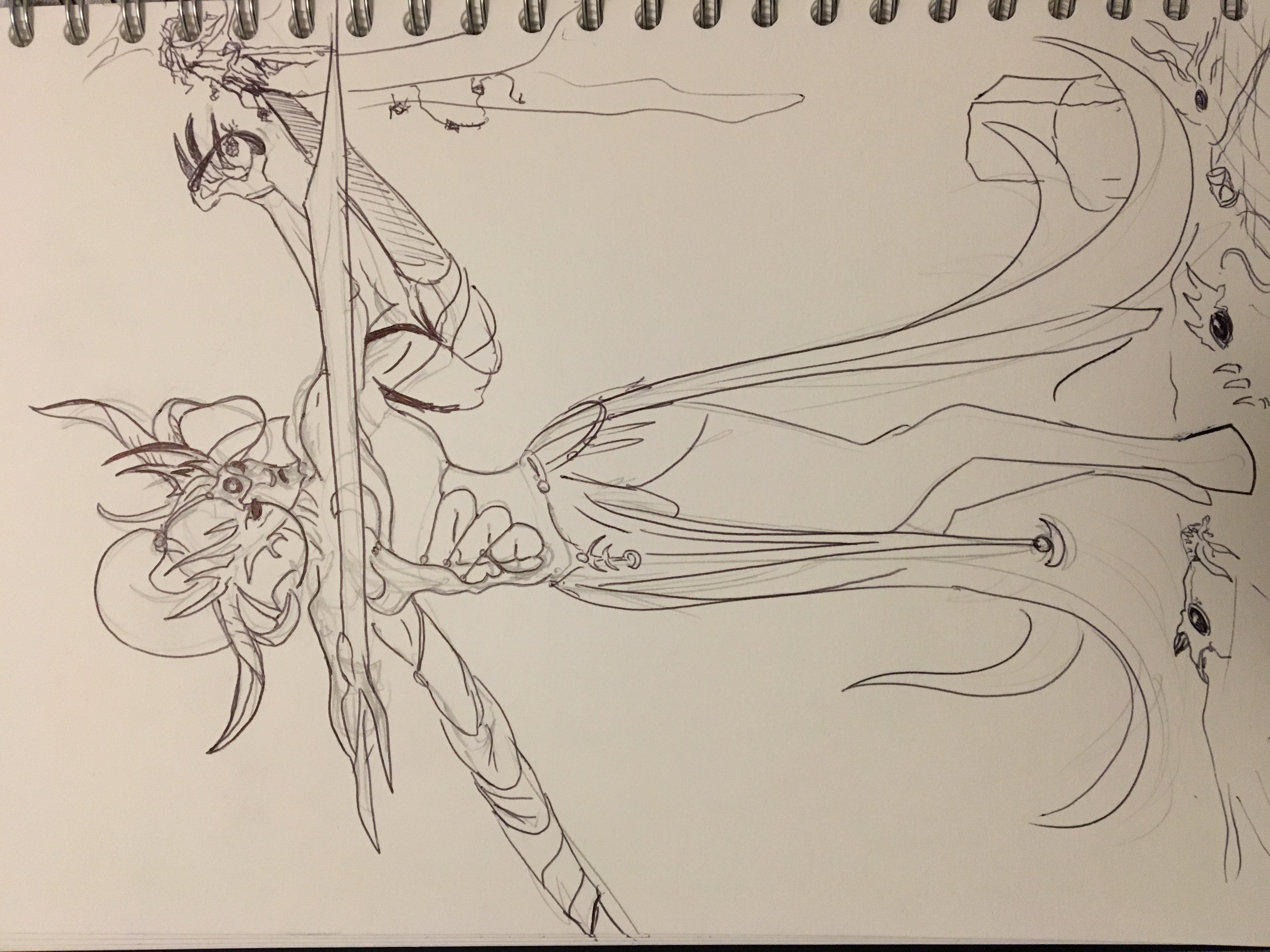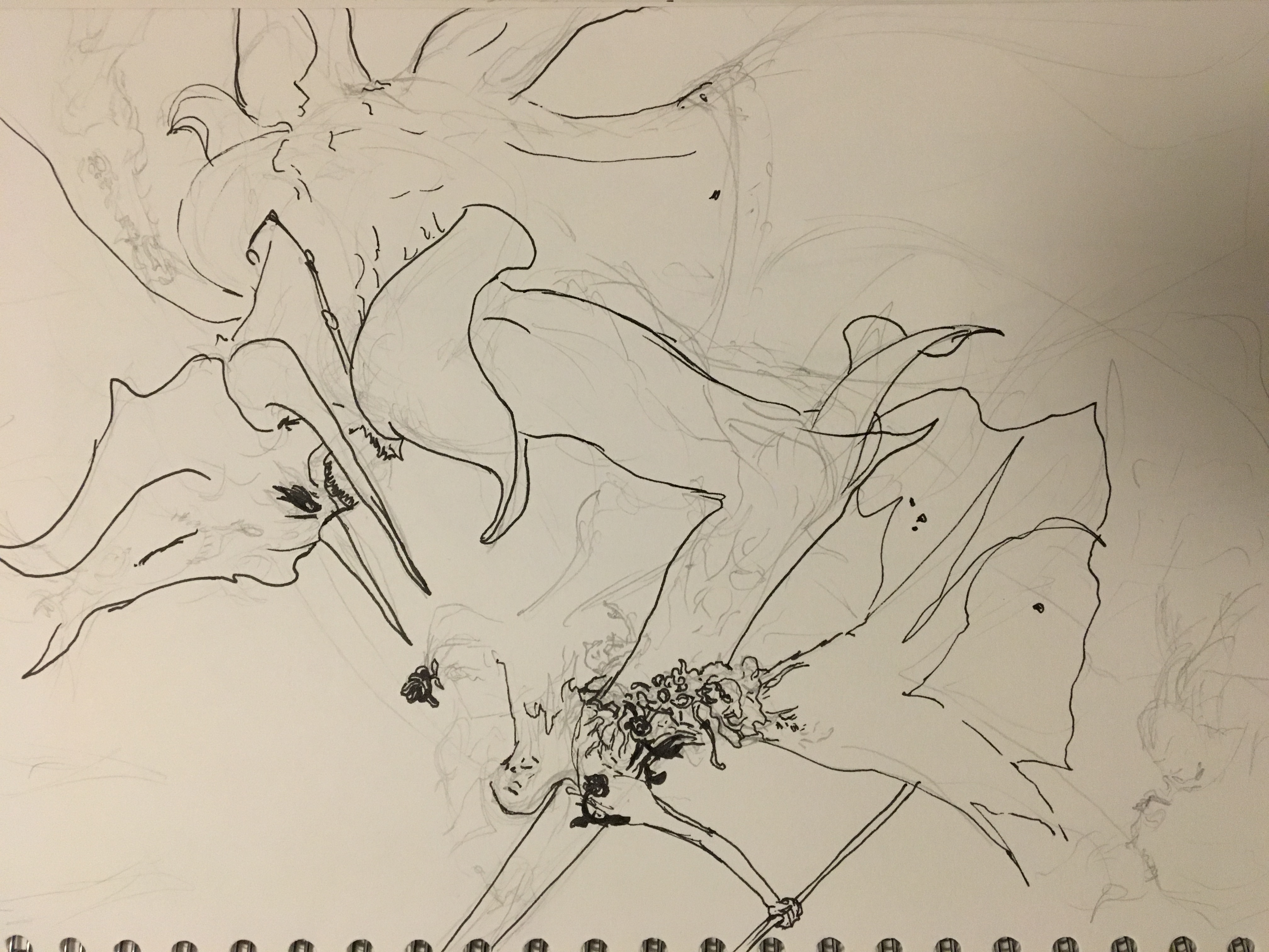 Some of these drawings relate to the outcome of that combat. Lady Olynder hangs eviscerated on Ego’s claws, the ontologically toxic essence of Chaos spreading through her incorporeal form. Ego mocks her by taking one of her grave roses.