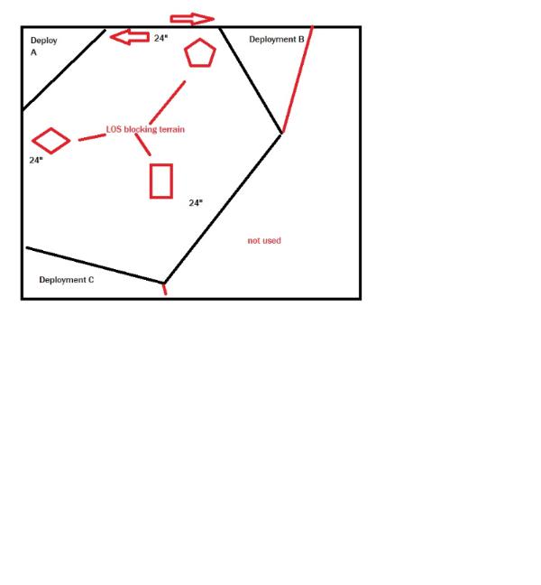 As pointed out above the key is table and terrain. You must set up three deployment zones in a triangle, very hard to do on a rectangle. This results in a very irregular hexagon, with the three sides representing 24" between regular sides and the length of each deployment zone adjusted shorter to retain the 24" gap. Start cutting across one corner of the table about 15" or so, use those edges to measure 24" down each table edge and set that as one edge of each of the other deployment zones. Then simply decide how much farther you want the table to go, and use more diagonals to set the other edges, making sure they are 24" apart. Generally this results in your table losing a foot or two the long way. I'll try and attach a crude drawing below. We also make sure there is LOS blocking terrain within the 24" of the shortest distance between deployment zones. The roll off for first placement also includes pick your deployment zone. I do warn you, these games can last longer.