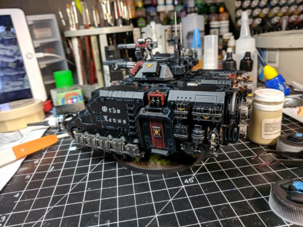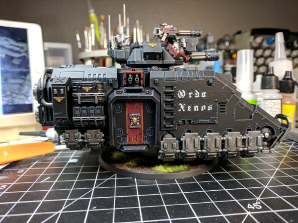 Here is my Repulsor I just (mostly) finished last night. I noticed some things I need to tidy up, like putting gloss varnish on lenses, but it's essentially finished. I'm really not happy with the Ordo Xenos 3rd party waterslide decals I used, and for some reason for the first time ever my gloss varnish over the top of them didn't settle so it's lumpy. It looks good except up real close though, so I don't think I'll bother going back and wet sanding unless I'm extremely bored someday. Lesson learned--I'll airbrush that too, from now on :/