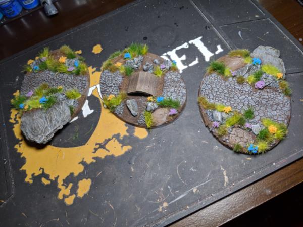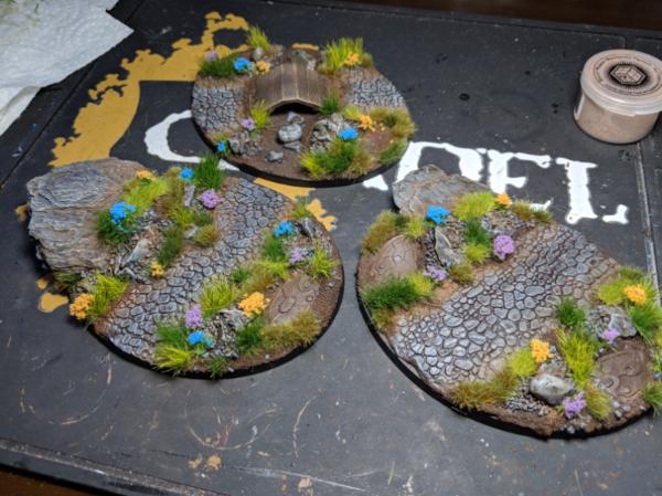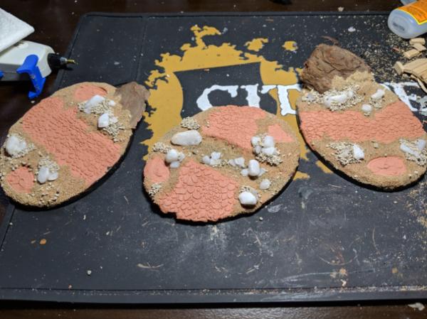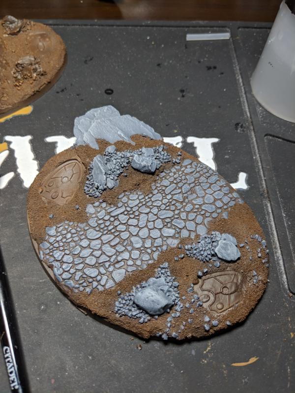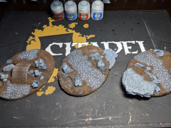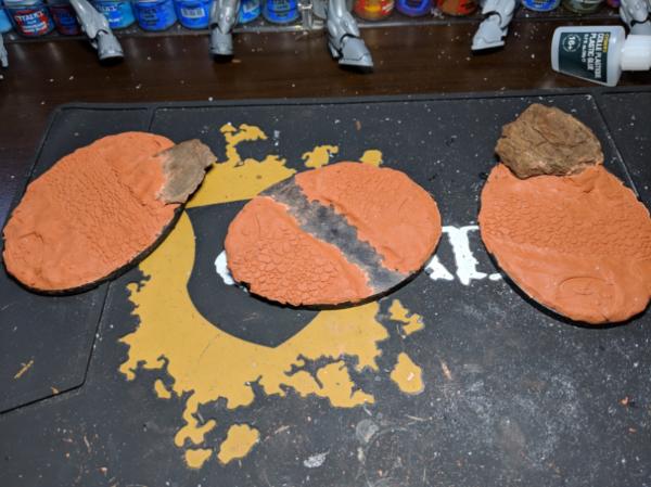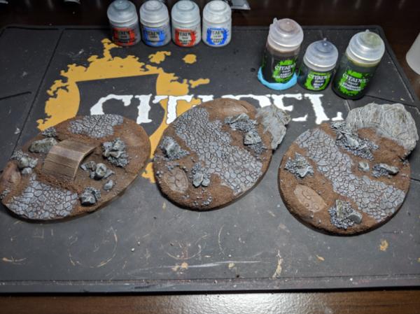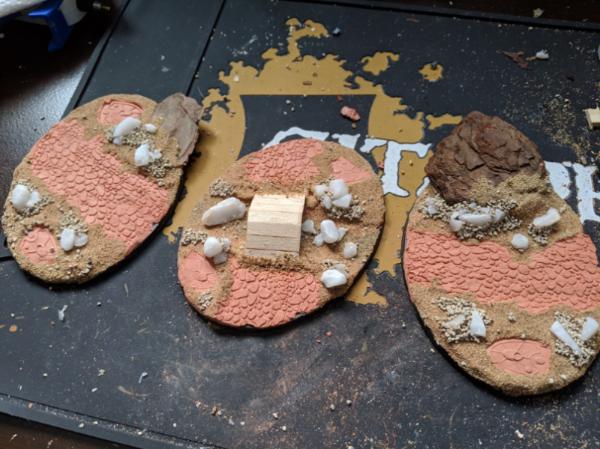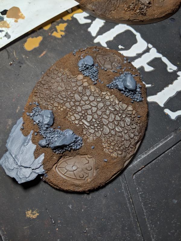Next I laid out some air-drying clay on the bases and positioned the things how I wanted them. I also used a Small Cobblestone rolling pin from GreenStuffWorld for that effect. I also added bark nuggets to simulate boulders/other rocks.