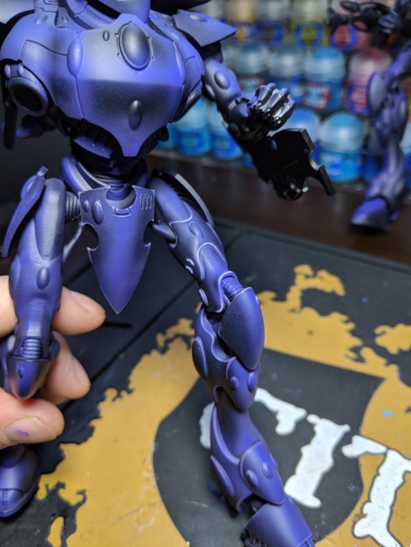 I simply airbrushed the majority of the model with Alien Purple (Vallejo Game Air) and then started doing some edge highlights. So far, I have 3 codpieces completed, haha. Here they are!