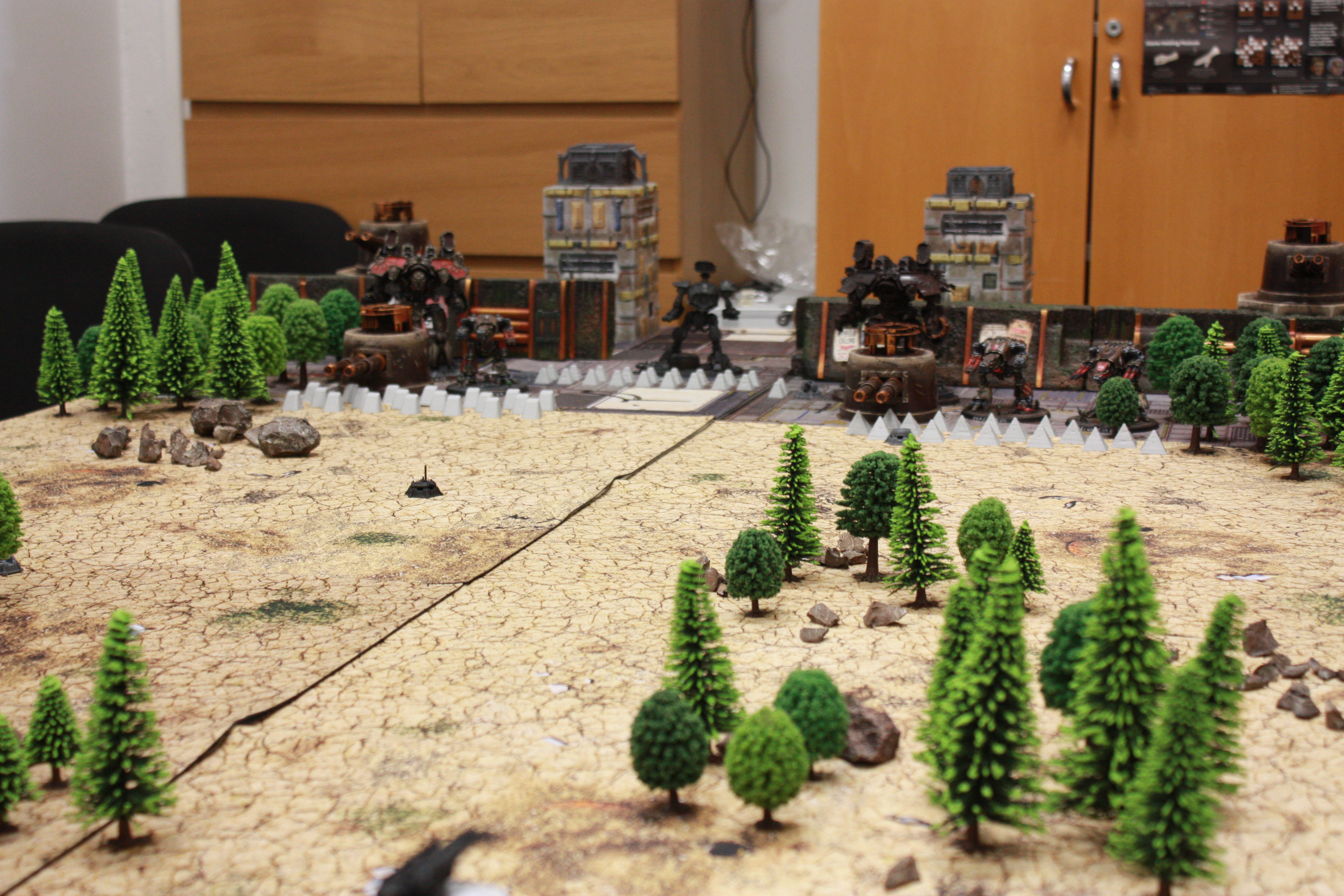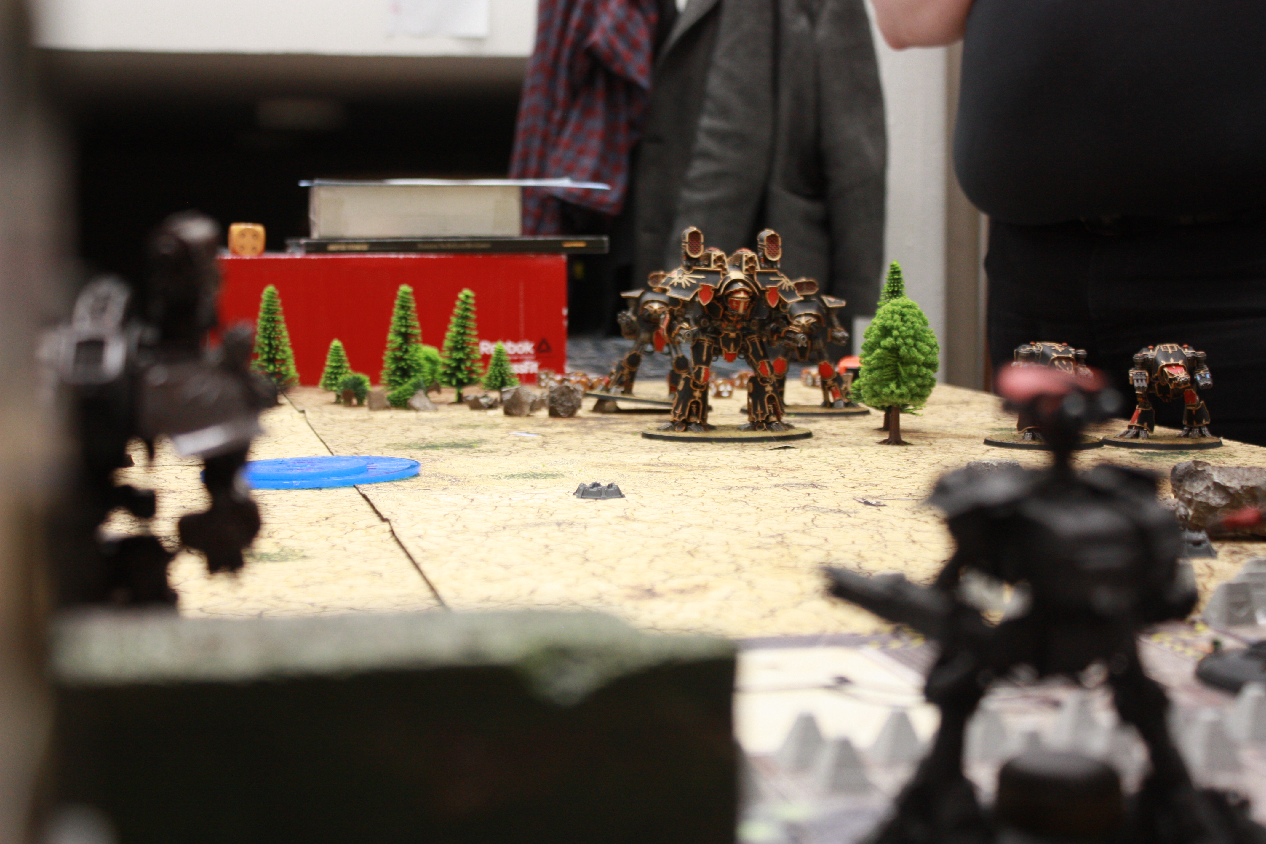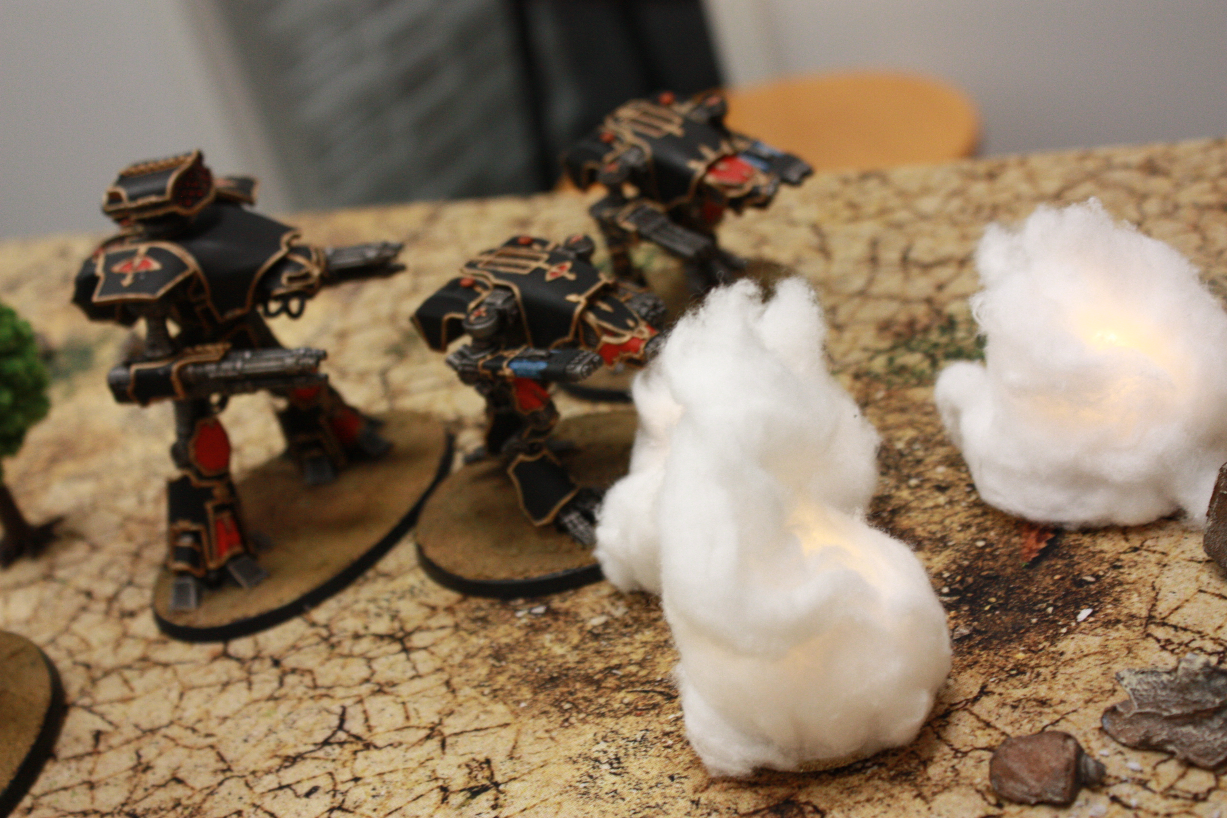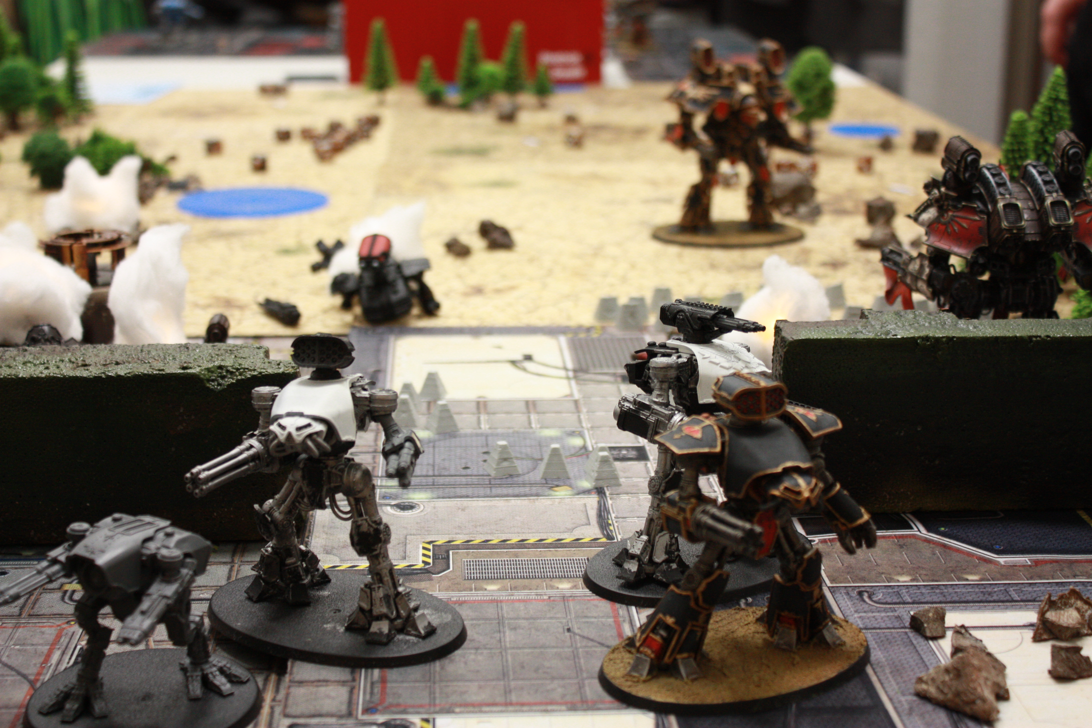Above there should be a comment "The battle is joined as the first artillery barrages rip shields off the center 'Hounds and the defending titans switch to First Fire orders. The melta Reaver attempts to dodge out of their way, which leaves the Warhounds behind to take fire and falter in their steps as Aurora Terribilis, the Reaver at the gates, unloads Earthbreaker missiles under them and cuts their movement in half. Their firepower gets pretty much neutered for the rest of the game, too, as their plasmas are blasted offline refuse to get back up any time soon."