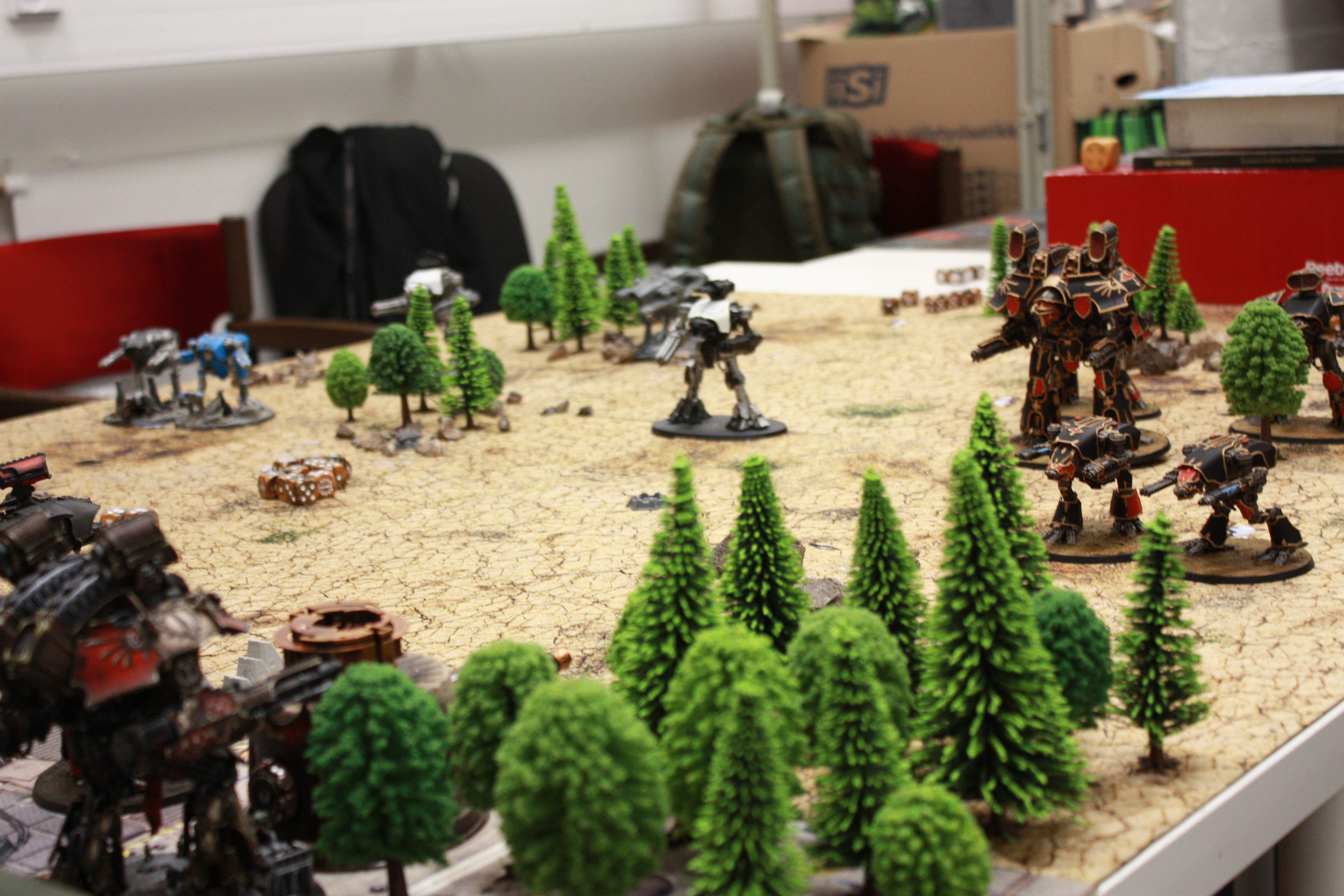 While the battered and bleeding Warlords are exchanging fire on the right, artillery fire is falling down everywhere. Echo Dolorum manages to get its legs working and backs towards the woods to get some final shots in without dying in the process, in vein as the last limping Warhound evades its fire by dashing into the city proper.