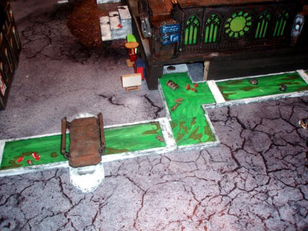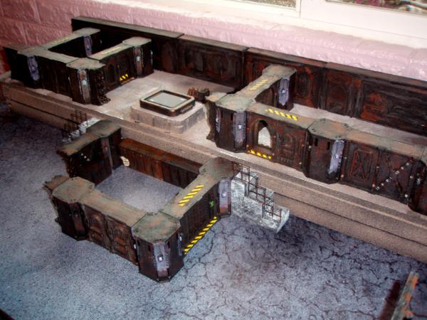 Just sharing my Hive City set-up. It's still WiP. Painting to do and always adding things. It's a combination of purchased items (such as Deathray designs hive city set up, and bits from everywhere) and scratch built. The sewer is made on leftover flooring. Pictures are sad because my camera is sad. The sewers have a water coat, and cans, bottles etc floating in it. most of it got the rust treatment which shows up best in the ramp seen in one corner next to the church. Happy with my billboard/recruitment thing. I also put whatever posters I could everywhere, particularly on Club Sewer in the middle. The elevators have top and bottom pegs so can be moved. It's all modular of course. Anyway, Pics.