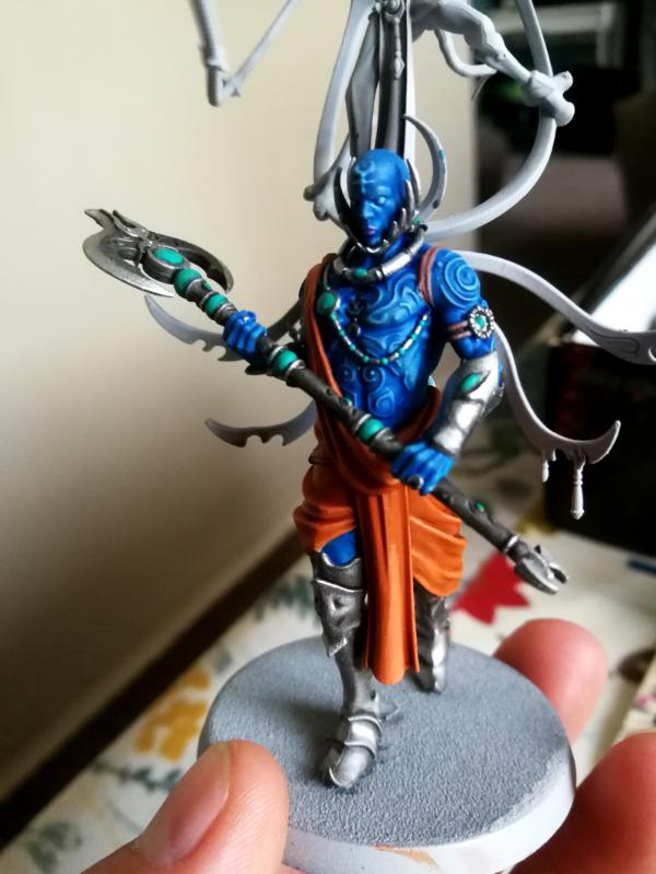 So I'm back after a haitus. Picked up Ssyl'eske the daemon Prince and herald of Slaanesh as I've never done a Slaaneshi Daemon and I've been thinking of skin tone ideas. I want to do them up like a Hindu god. So blue skin, orange robes and bright silver jewellery with rubies for gemstones. I'm priming corax white. What do I need to do to get a depiction of for example Kali or Shiva. I was thinking caledor sky and then share with drakkenhoff nightshade then layer up caledor sky with a lighter blue and pick out all his gorgeous scars with a lighter blue again before a final pass with the wash to bring it together. Or should I bite the bullet and use a contrast paint?
