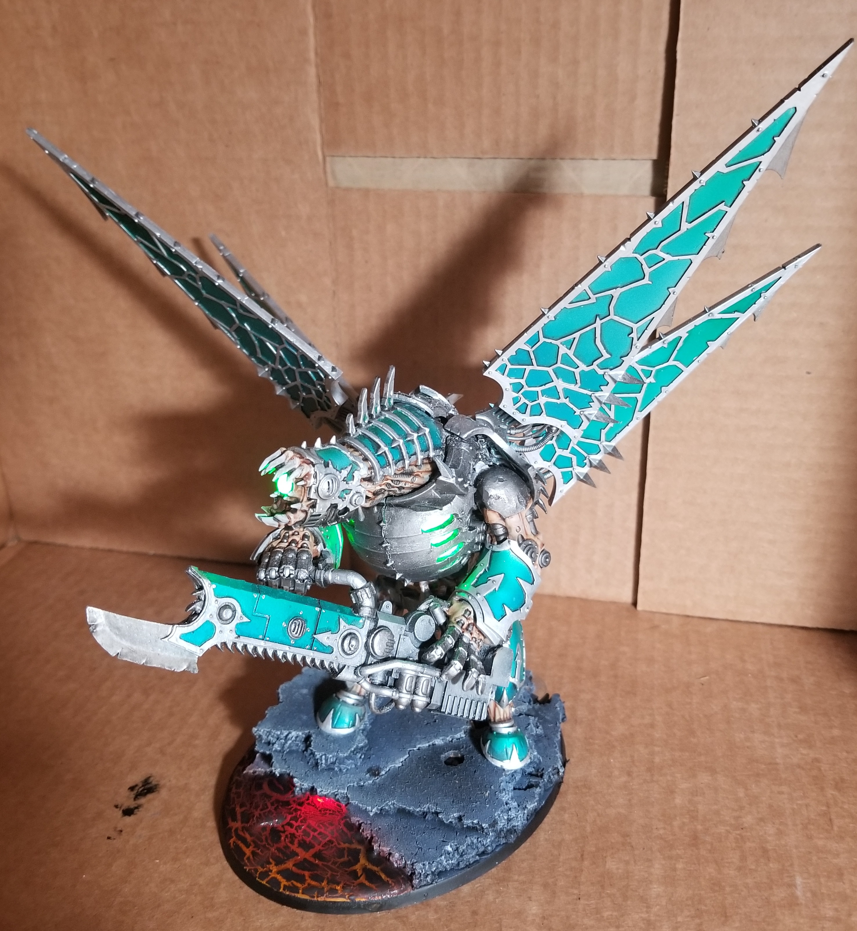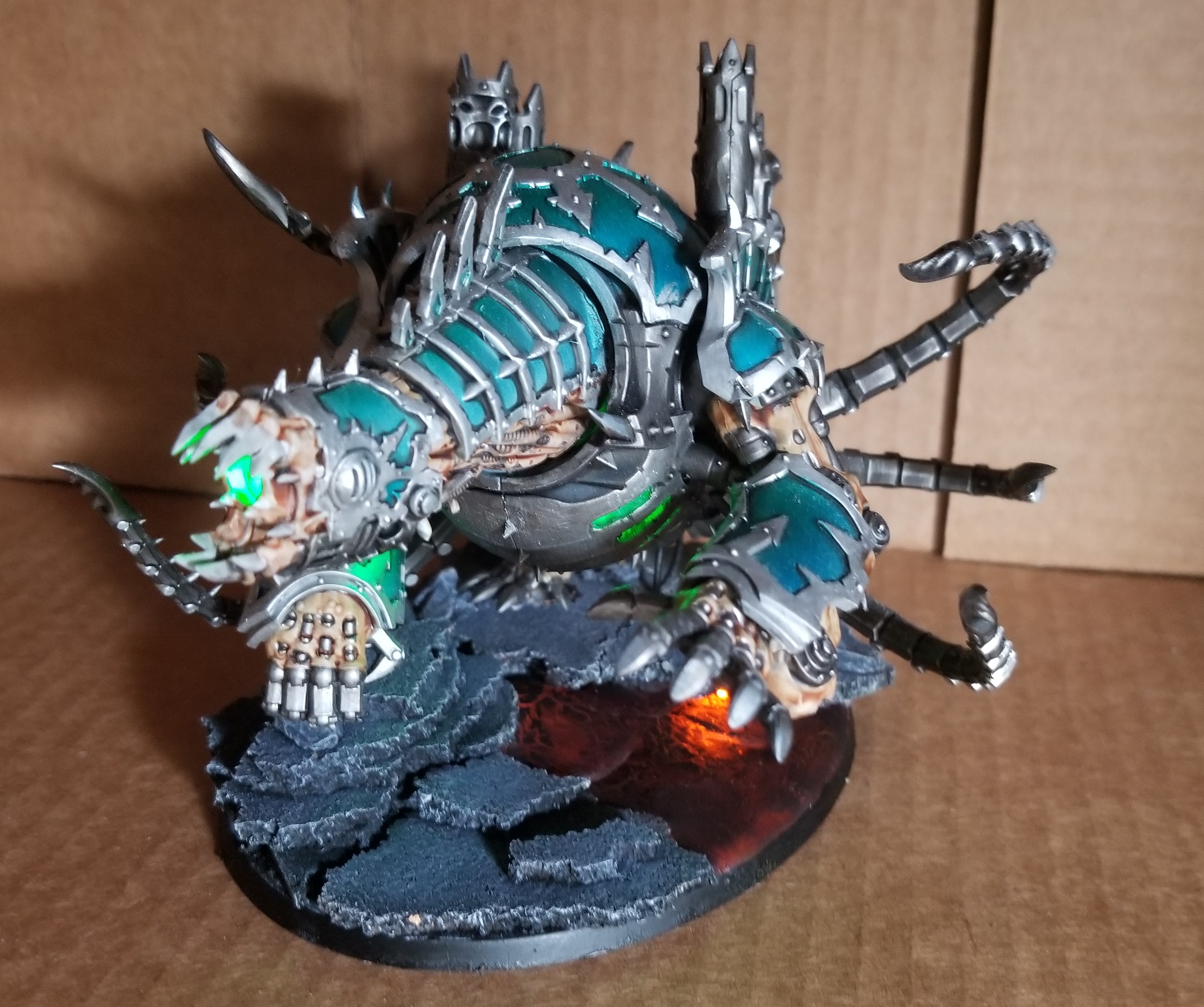 As ATC looms ever closer I push this army to full completion. Though this is only about half the demon engines in the army, there is still a fair amount to be done on the remaining discordants and heldrakes before the big event! I tried out the FW alpha legion scheme with the shift from blue to green and love the result! This is my newest LED project lighting the vents and mouths of the demon engines, as well as the red glow of the jet engines on the heldrakes and my custom Mecha-BloodThirster! On the ground based Demons I went ahead and tried out a new style of LED lava base, and I love how it turned out!!
