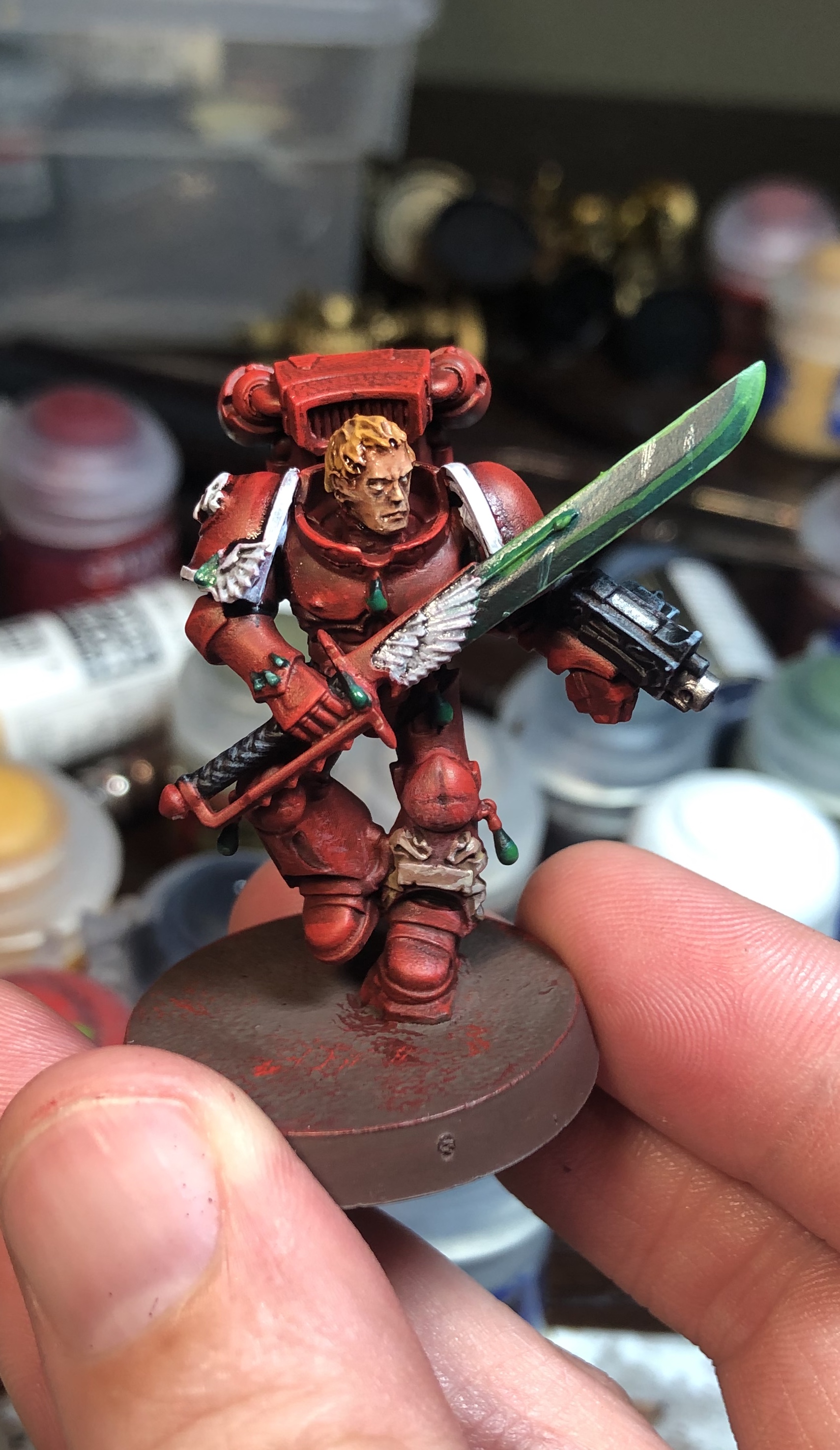 Your red looks fine but the only thing I'd recommend experimenting with if you really want them to pop is try spraying with some cheap gold spray paint and carefully paint on the new Blood Angels red contrast paint. You get this metallic red like the FW Thousand Sons that would make them look less like regular Blood Angel infantry. Kinda depends on the look you're going for.