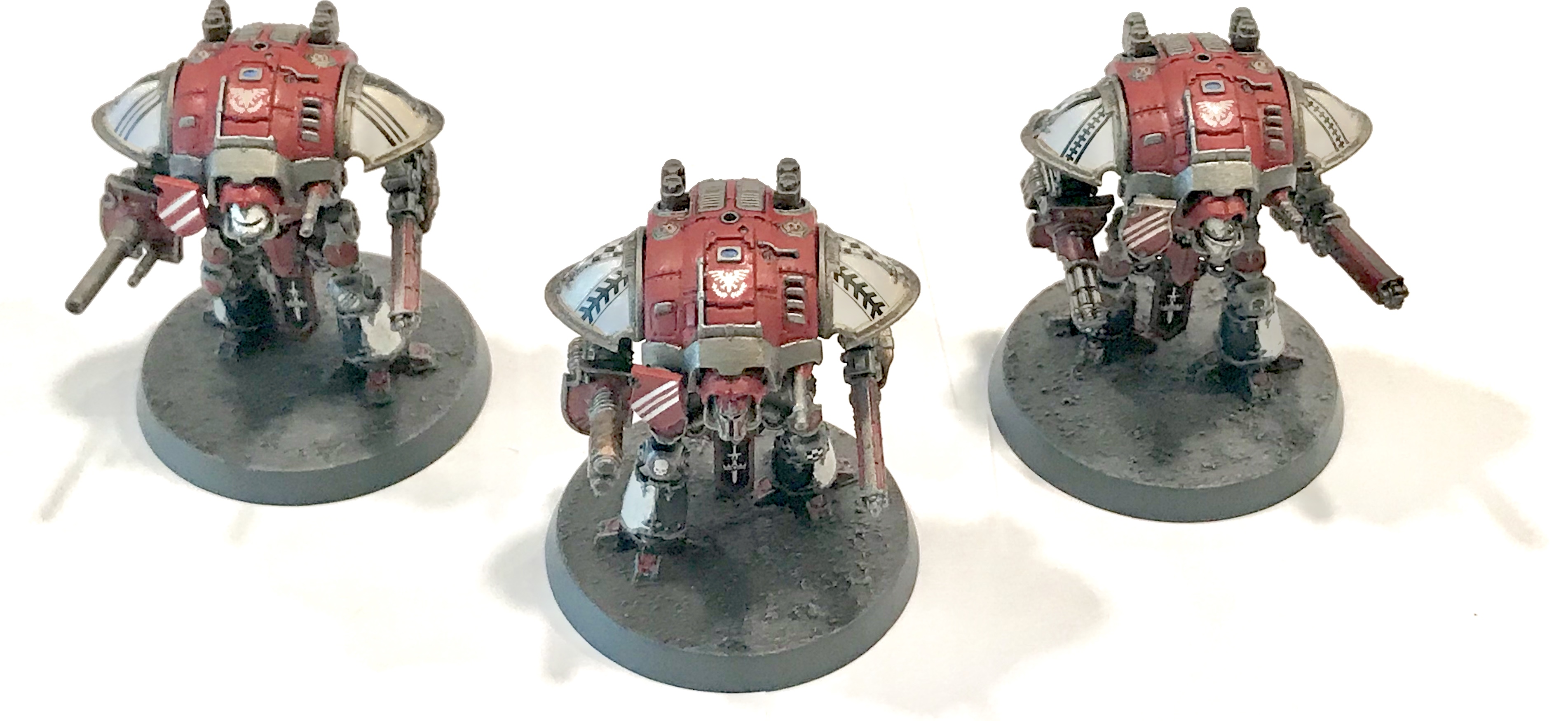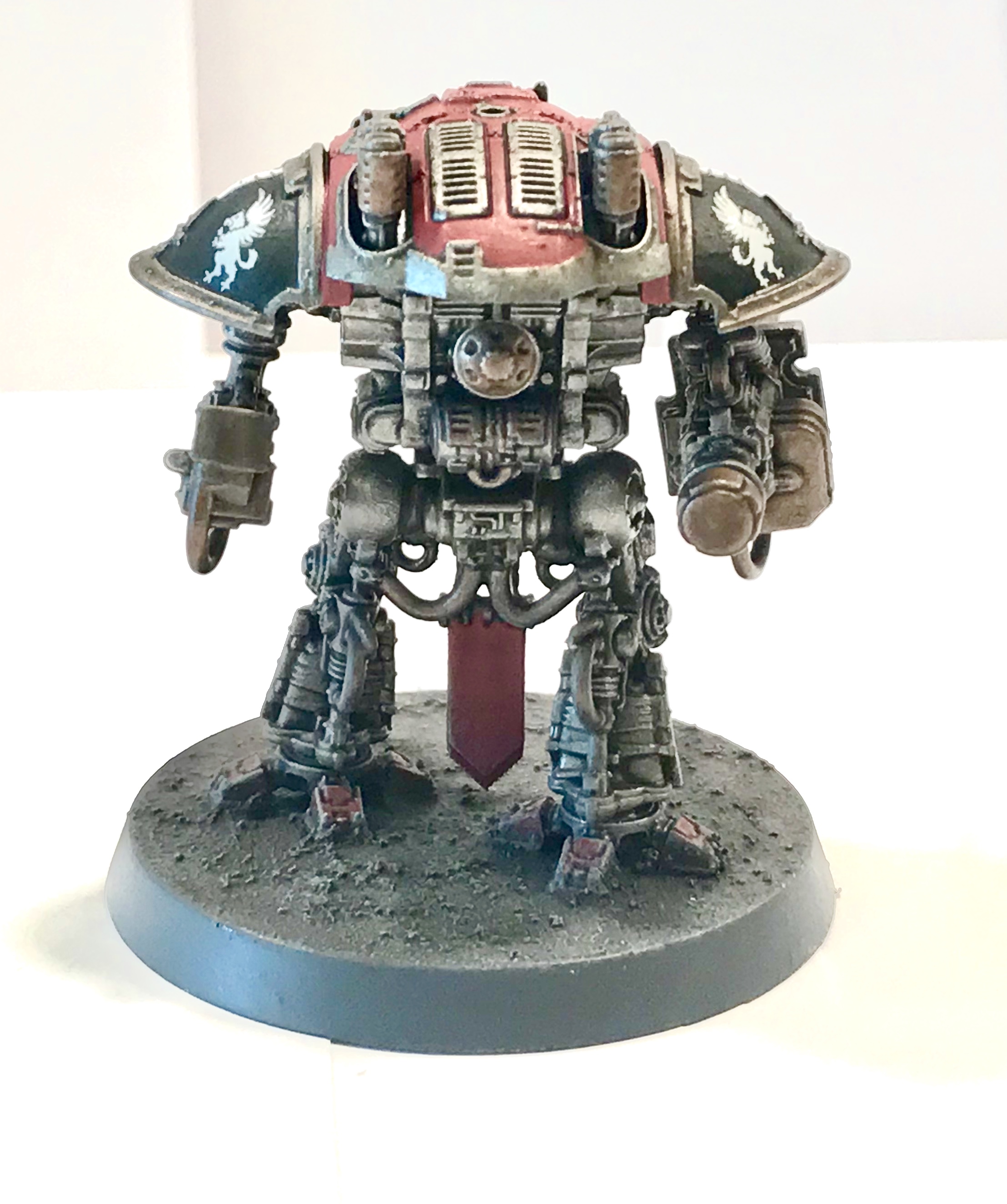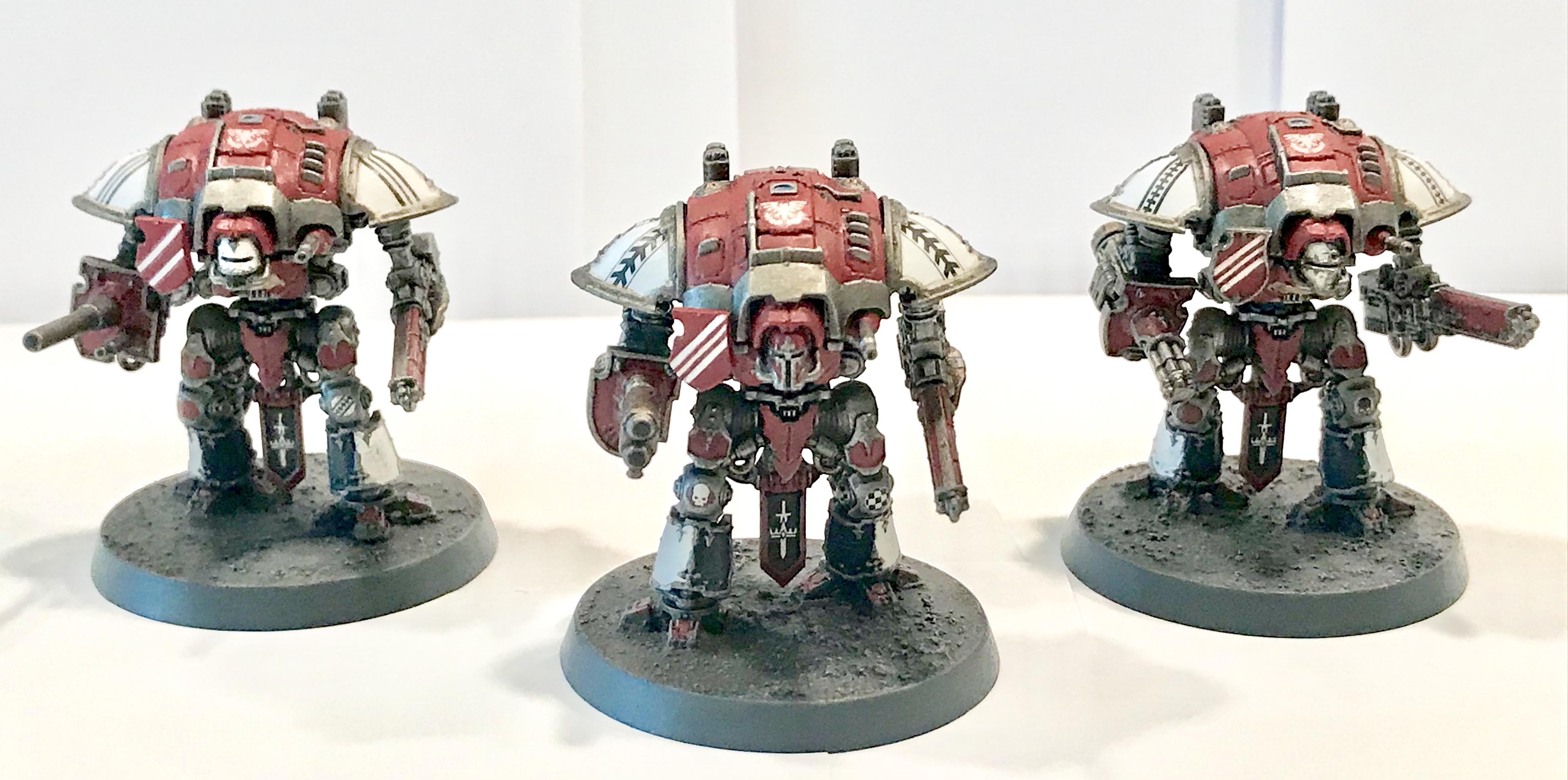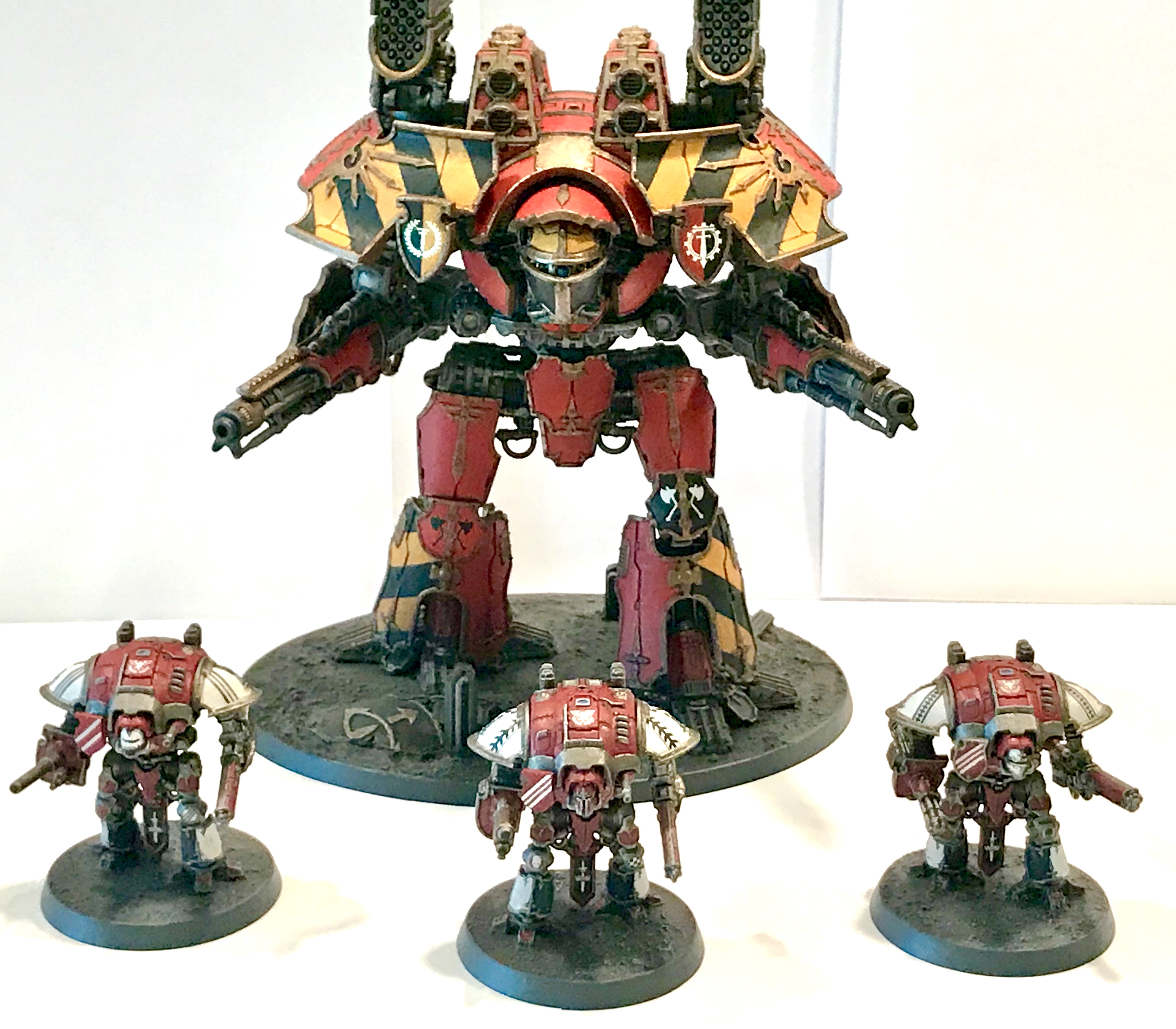 Just finished my first squad of knights, I painted them in a House Taranis scheme, I think it goes well with my Fire Wasp Warlord. Let me know what you think of my work below,thanks