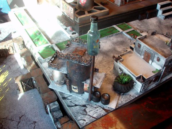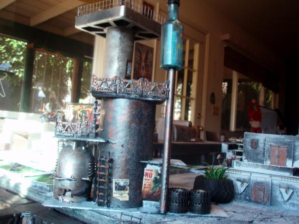This is the craft beer brewery Lightning 81. Another scratch build using base and balsa wood etc. That kiln thingy is a blinker light part I found on the road. The bottles (the small ones) are dowels shaped with a dremel. The broken ones are plasticard hollow tubes cut and shaped. i paint the spills with watery colors then cover them with water effect.