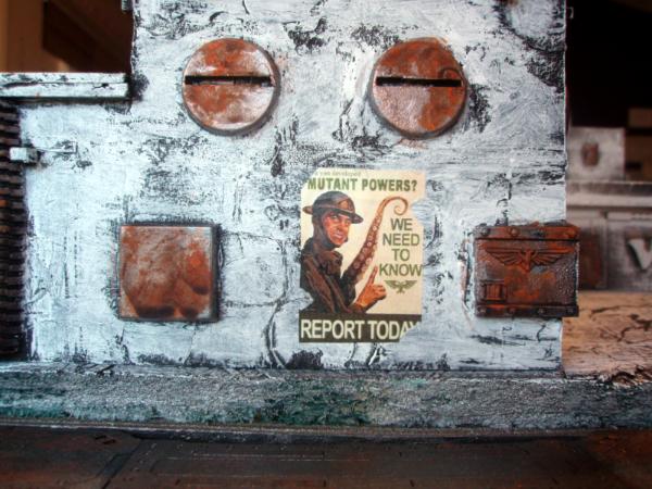 Next is the local government station. It's built like a fortress, although that hasn't stopped the gangs from tagging it. This one is NOT scratch built, but a modified building I bought a LONG time ago from an Australian company called Miniature Scenery. They can now be bought in the USA through Every Little War and I really recomend them. Good stuff and easily painted into great looking stuff.