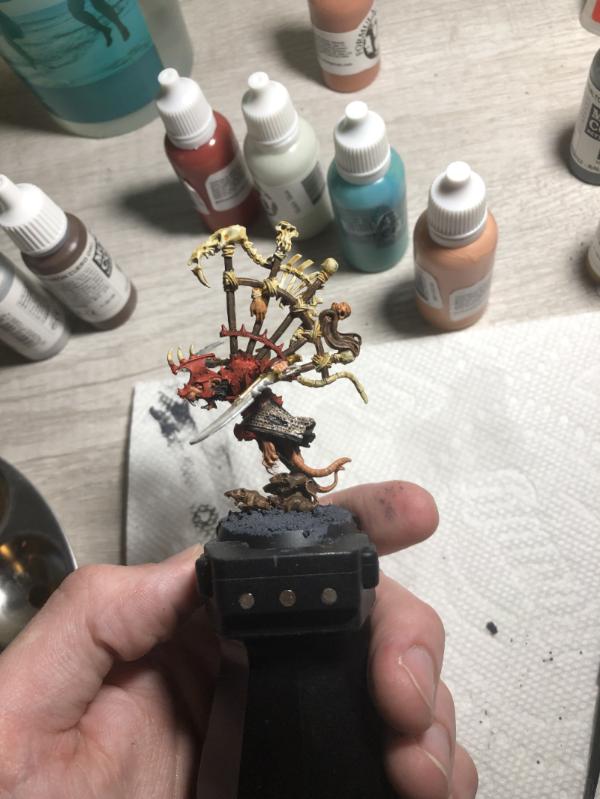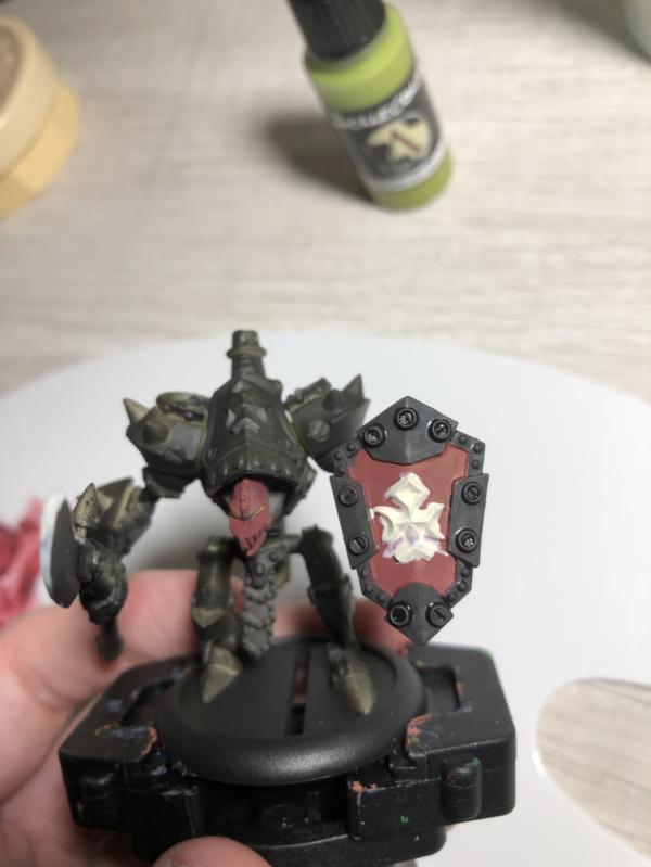 This one I'm far more satisfied with. I basecoated most of it with brown, then painted the red over that. While it's still very much a work in progress, I'm a lot more satisfied with the red. I also took the chance to test out the bone color and the green for the eye lens.