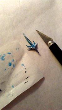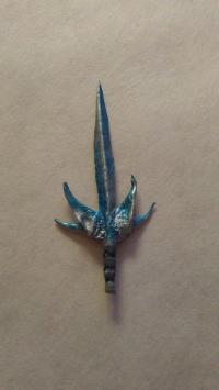 The sculpt consists of one mini-bit forge for the blade, one for the handle, sculpt welded to the blade, and four droplets glued to the hilt individually. Again, let everything dry on the gloss side of a piece of wax paper.