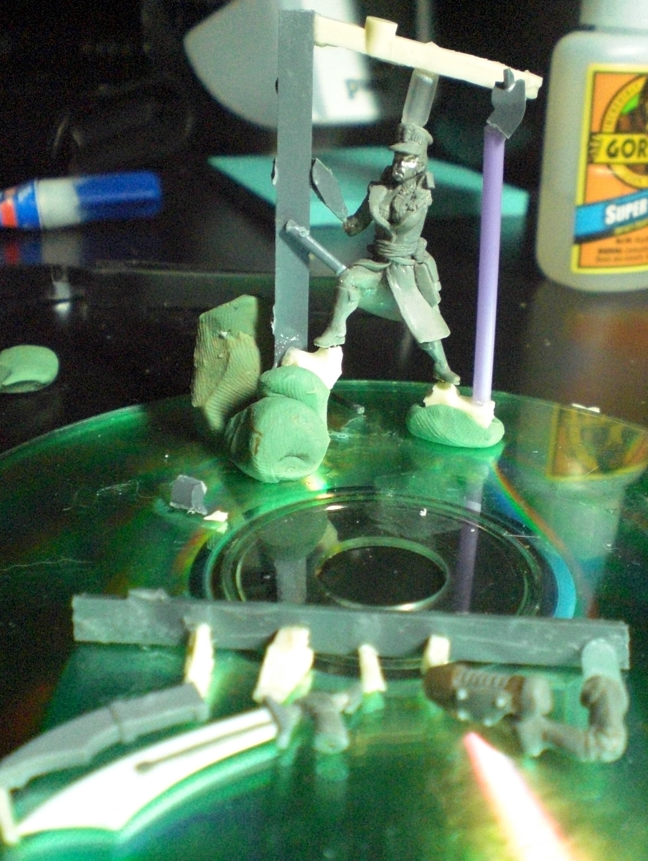 Ok, blurry pic of the lass on her strange looking sprue. Not sure if heads up is the best way to do it, but it does mean I get to lift her coat bits out of the mold, instead of peeling them out, and that big flat hat top is too tempting a main pour spot to pass up
