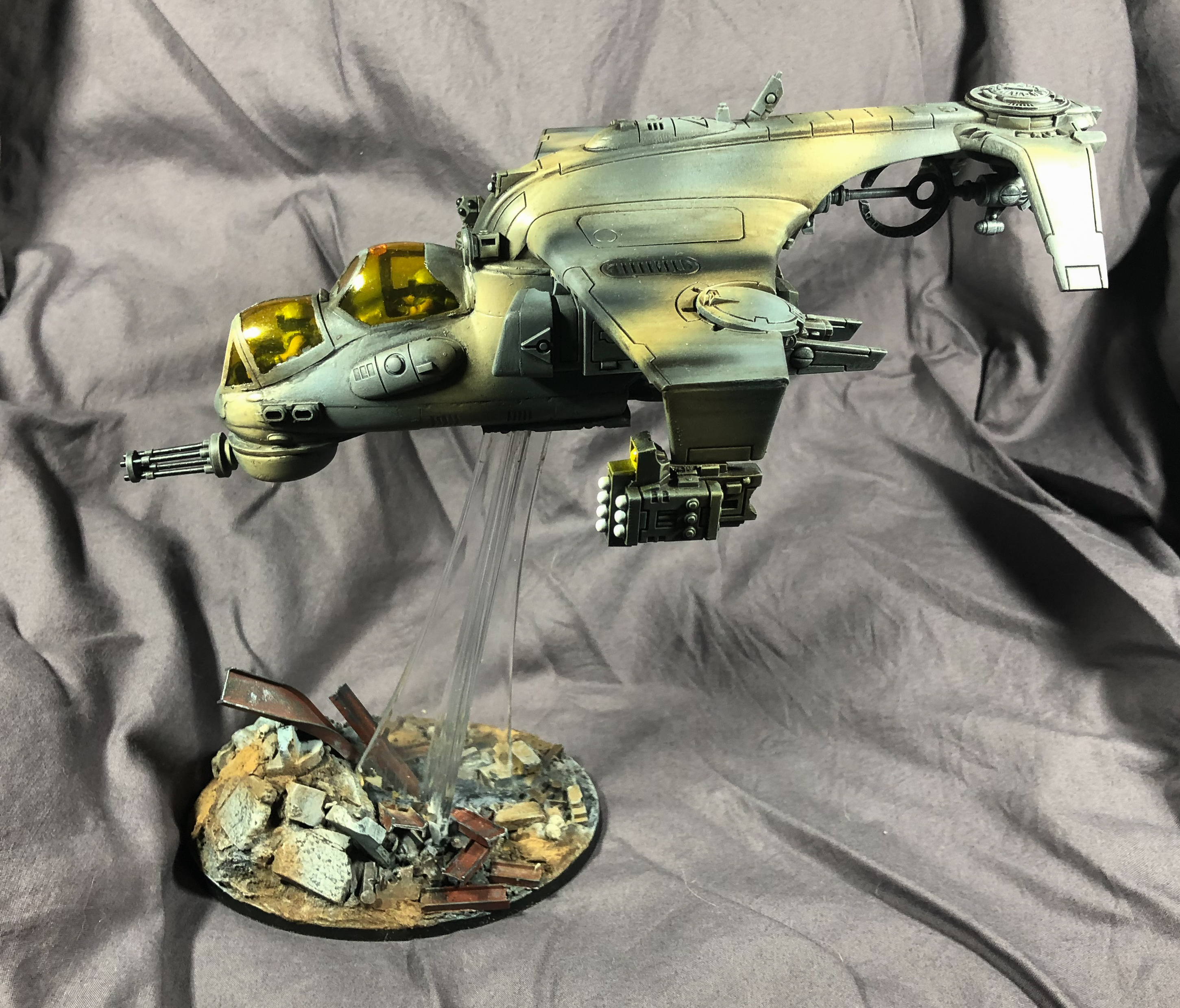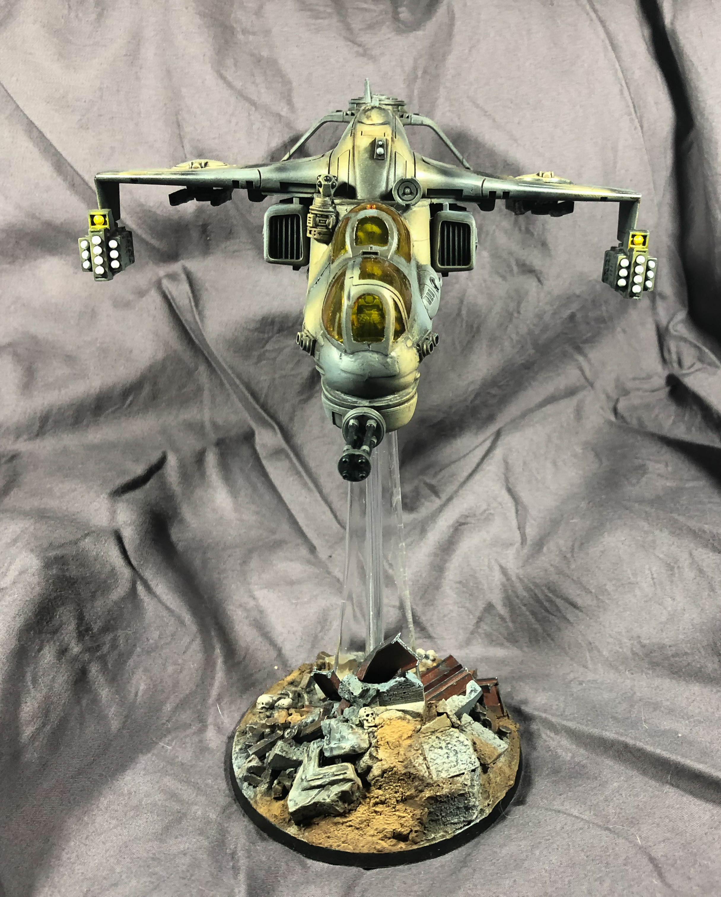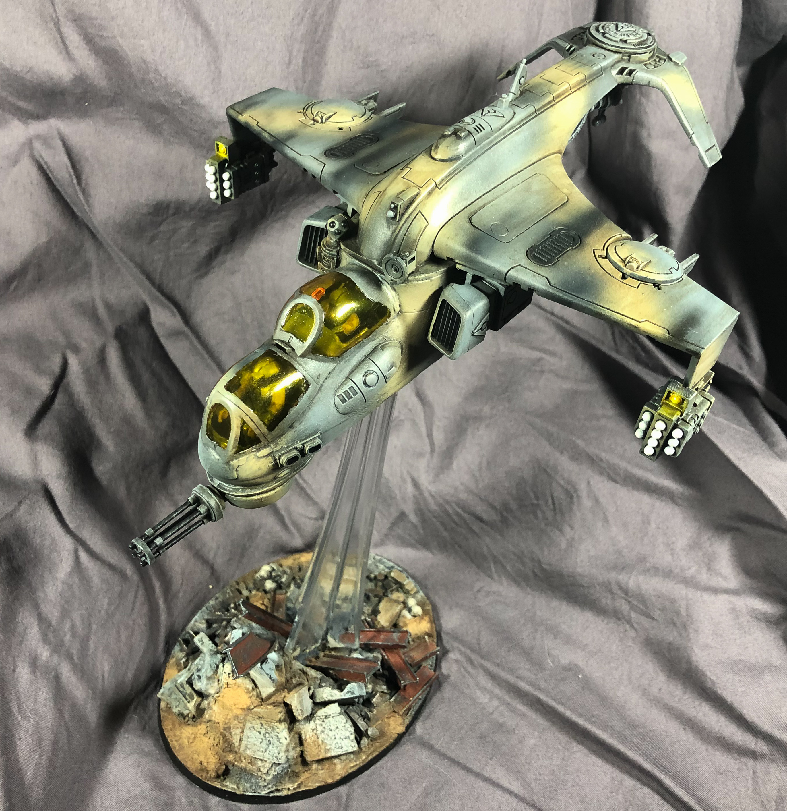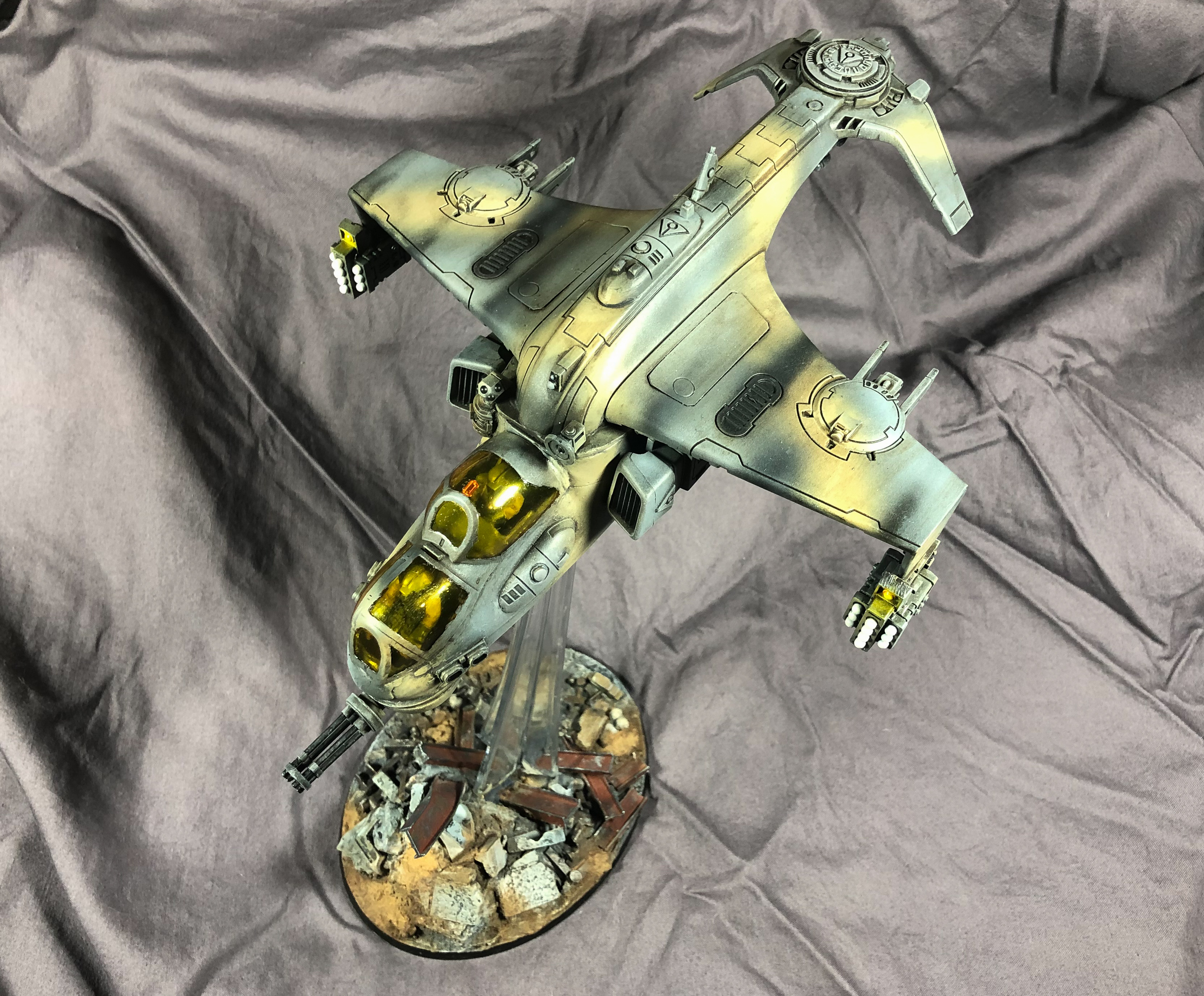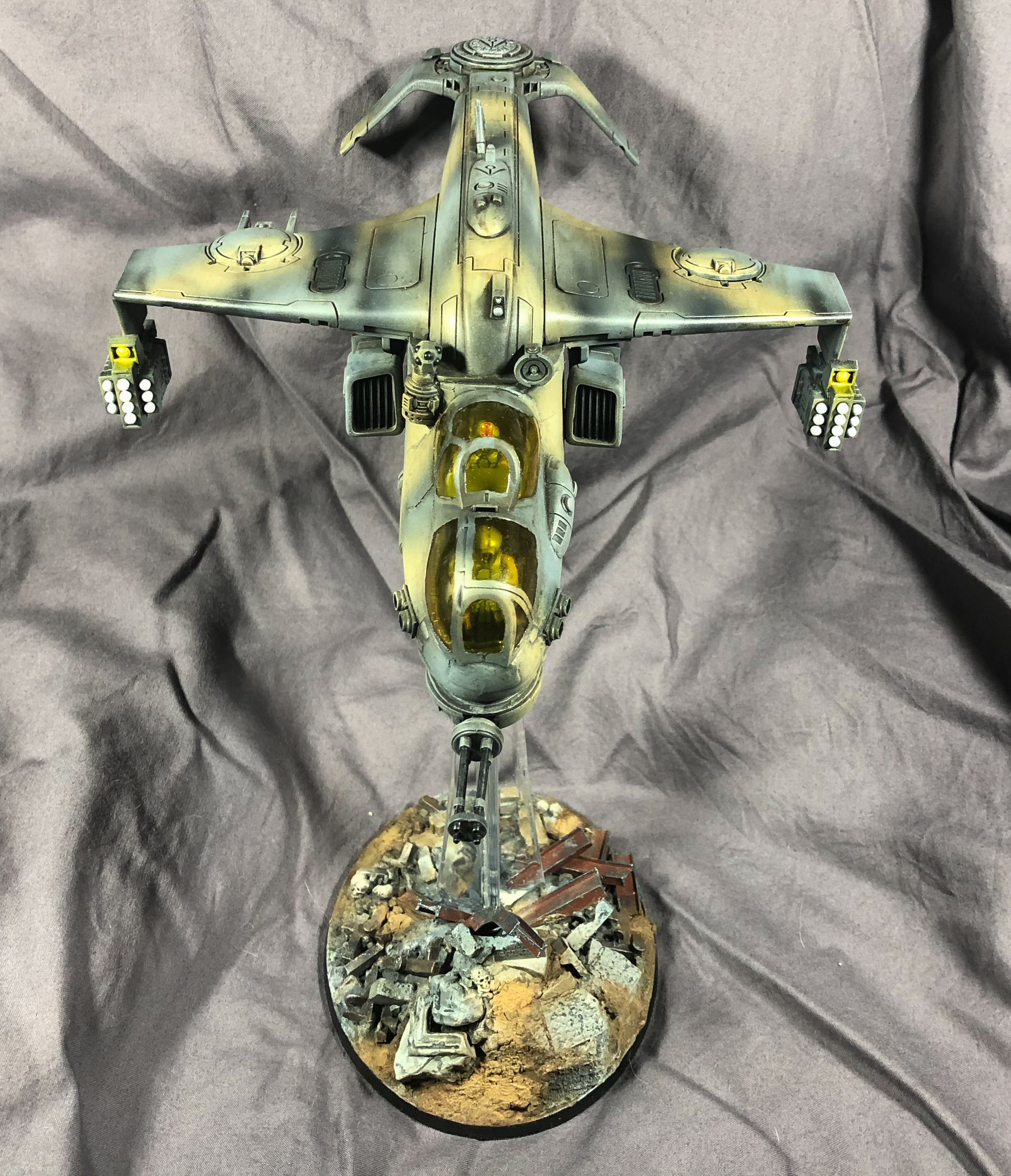 Hi guys - here is my kitbashed Tau Hind Mil-24 Sun Shark/Razorshark. I have never really done a kitbash on this scale before using two totally different kits - this was the standard Sun Shark kit and a 1/48 scale Hind. There was an extraordinary amount of plasticard used as well, although you can't really see it in the finished model - maybe that's a good thing. A lot of sawing and cutting and a heap of skills I used for the first time. It's not perfect, but I am abandoning it now as I have been working on this non-stop for what feels like hundreds of hours and I want to move on to something else. Anyway, hope you like it, something a bit different.
