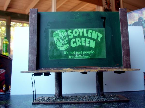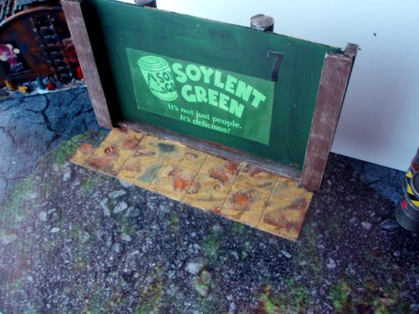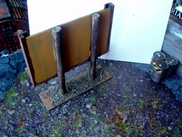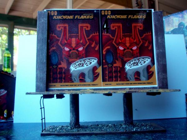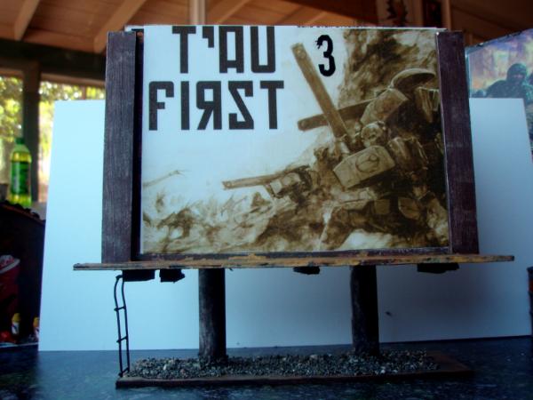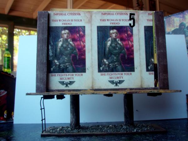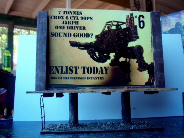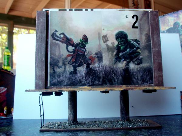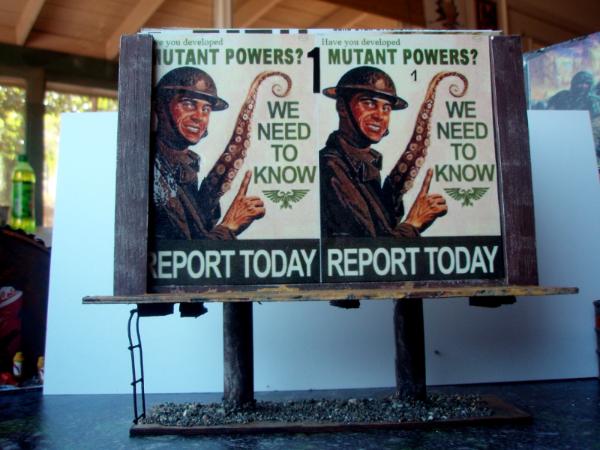 I have been making billboards for my terrain boards for a while now, and somehow this whole idea escaped me. Anyway, I now make my billboards with slots so that they can be changed for some variety. That led to numbering the artwork, and bam, turn counter (if we ever remember to use it). Generally the person who wins the roll off also gets to decide what billboard is up.Again, these pictures are the genius of people from the internet. If I could find them I would thank them, they made some very nice stuff. This is sort of a prototype. I plan to give it more detail, and probably choose pictures that seem more like real billboard/propoganda. Anyway, pics in order of turns.