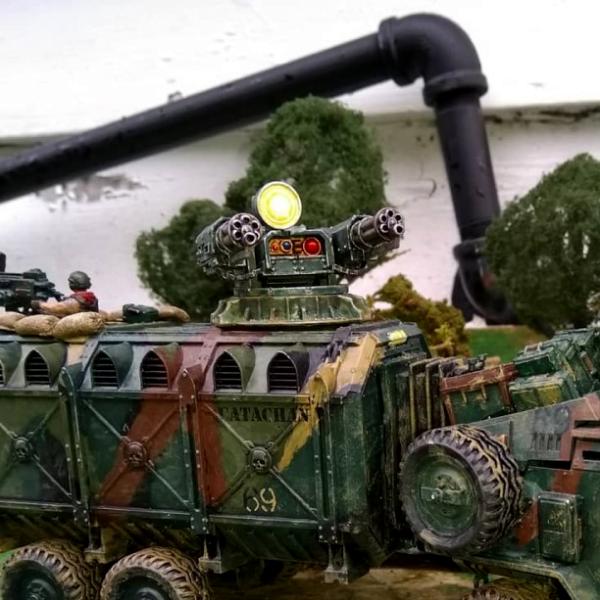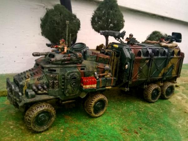 In all we had a couple dozen wounded, but no dead, and several vehicles seriously damaged but even the ones missing a wheel managed to make it to the relative safety of our destination. We made a second run back to our base that same day, against weakened opposition, and another that night which passed straight through. The command staff credited our success to the fighting qualities of the Catachans, fighting qualities they had previously been keen to overlook or even discount, and suggested a few summary executions among the unit that had failed. Those troops, were well trained Gudrunites, and had fought well but with the wrong gear so we managed to find some more of the Canyoneros which were not being used to their full military potential and pressed them into service. We formed mixed groups interspersing different types of vehicles and cross trained or cross loaded the troops as best we could, and within a couple days the Speed Freeks of the Shiny and Chrome Clan were little more than an annoyance to our larger efforts. While I don’t recommend this as a replacement for our assault vehicles these road-trains can indeed prove their worth on any battlefield where the supply lines are threatened by insurgents or light and mobile enemy forces.”