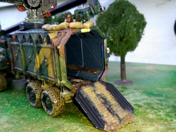 Designed as an armored supply hauler the Canyonero Road-Train has seen extensive use by the Imperium of Man particularly with the forces of the Imperial Guard. While sometimes assumed as a cumbersome heavy vehicle, it shows surprising mobility and maneuverability for a vehicle of its size because of its 8×8 propulsion and fully articulating rear axle allowing for much better control and tighter turns. While the rear section can be detached this is usually only done in an emergency. The vehicle has proven effective, and even popular, for convoy operations through hostile areas because in contrast to other Imperial armored utility vehicles its weapons can all fire in nearly any direction. The joining diaphragm is sometimes assumed as a weak-point, but is resilient against small arms, and the different compartments can be sealed from each other for maximum crew protection which has also made it a popular vehicle for transporting hazardous materials. While the height makes it an obvious target it’s a necessary feature for the angled boat-shaped hull which is highly resistant against mines and roadside bombs. During assaults the height is often used to move squads of infantry into the second level of structures, while maintaining full security, thereby bypassing the likely enemy defense plans for buildings centering on entry from the ground floor. During civil instability it is often also used defensively to form improvised walls against rioters, among other uses.