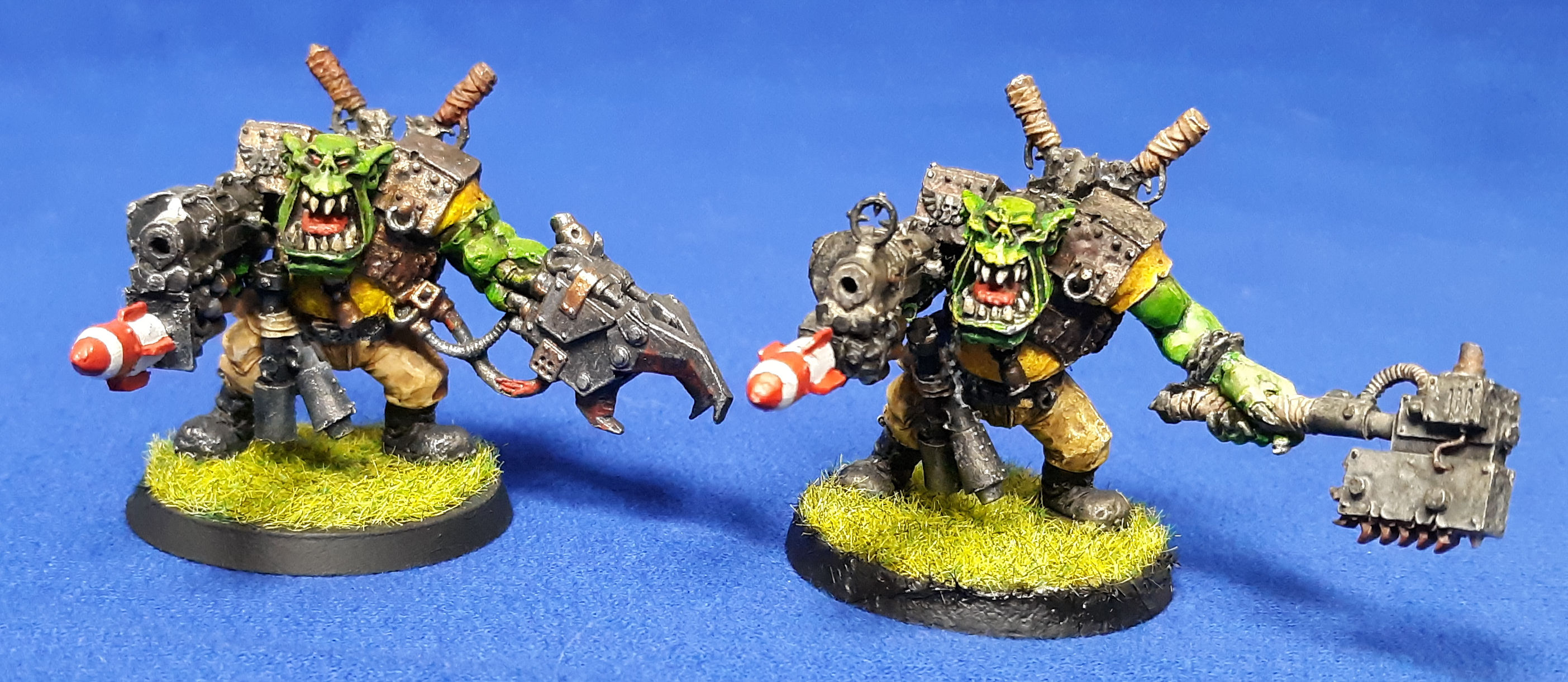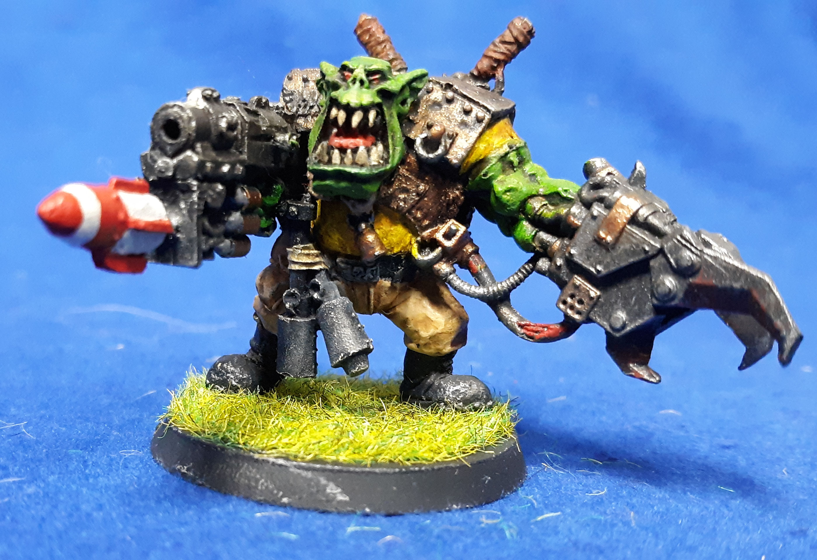 I started playing 40k in 1991 back when you could go to the local game shop and pick up figs no one wanted for $.25 and you had to build most of what you wanted for Orks because there just wasn't that much out there,. And bits were easy to come by, even when I quit playing for a few years I still worked on my Orks they were just too much fun to create stuff for. At one point I had a 20,000 point Ork army and a 4,000 point Bug army. No really I had tons of boys, over 30 bykes, 9 kopters, 6 Stompas, a Great Gargant and a lot of other vehicles, some are posted here on Dakka Dakka with more to come. Most were lost in a house fire in 2015 but I was able to save some and I'm building again. Lost all but 2 Bugs though, and not redoing them. This Picture was, and still is my War Boss, Bull Gunta Grimm Smakk his paint got a little damaged in the fire and he's missing the skull on his shoulder and one is missing his target-er on his Ogrin Gun but They survived paint was damaged from the heat. (I have 2 just alike but with different weapons.(same heads and bodies this was about the time or a little before I figured out about magnets.))