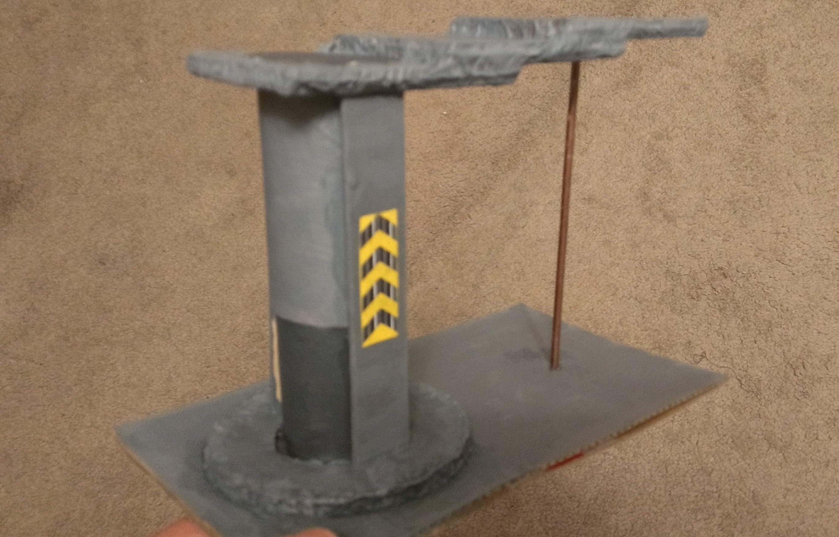 (2 layers of corrugated cardboard for pad and for base - strengthened and covered ends with toilet paper and PVA, cut kitchen roll tube for trunk, printed yellow and black markers and Aquila symbol - covered in PVA for durability, painted with acrylic paint, cut bamboo skewer painted with Castellax Bronze for pipe).